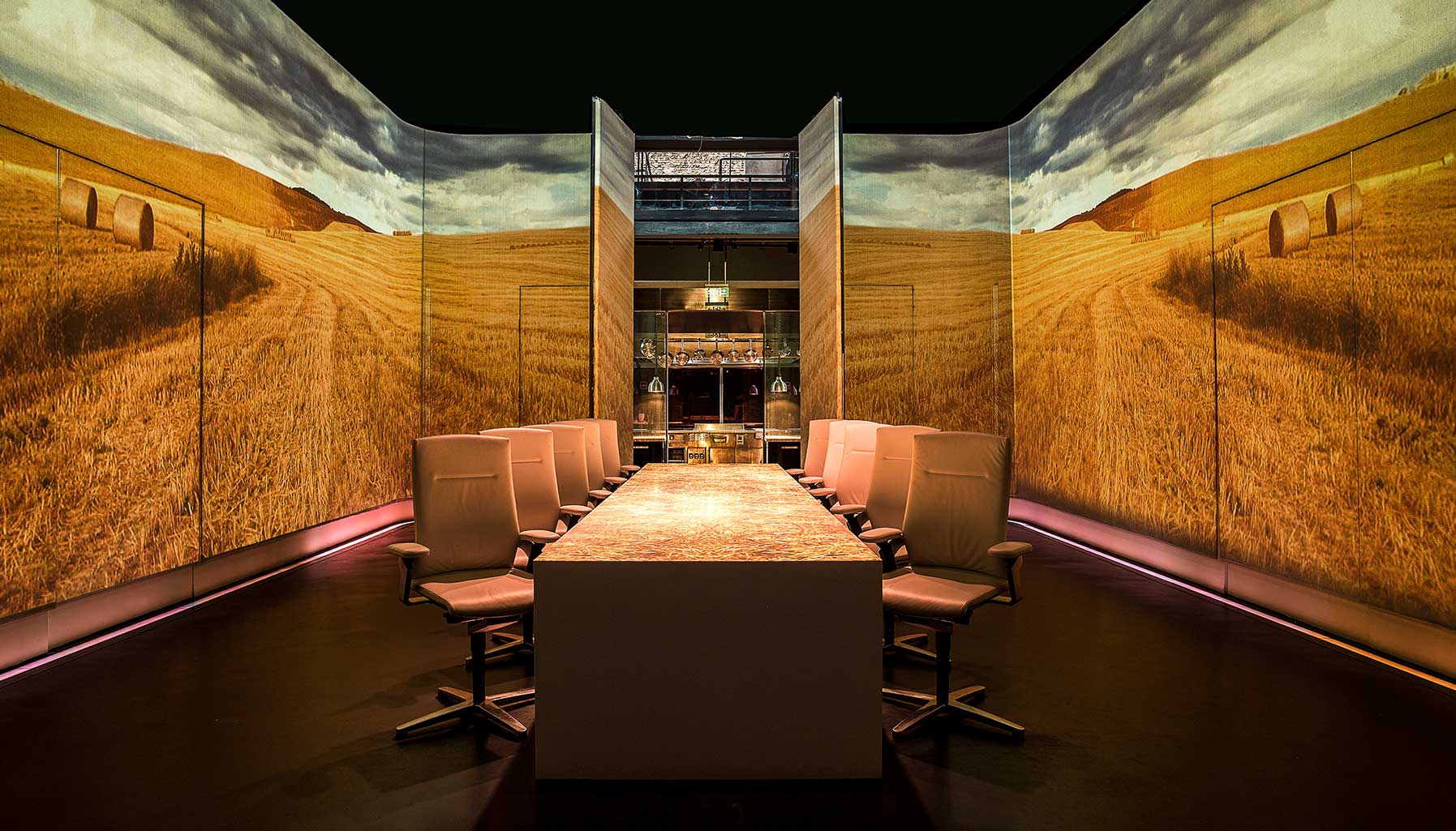 Two different lobster dishes are served: lobster poached in sea water is accompanied by projections of fierce waves and crashing sounds to recreate the scene of fishermen cooking at sea, whilst a grilled lobster dish is joined by calm images of a beach in Bali.