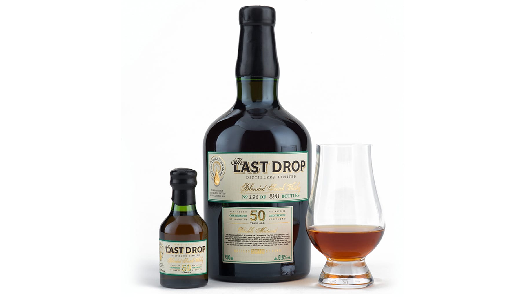 The bottle is housed in a forest-green leather case and comes with a signed certificate of bottling. And because The Last Drop knows the mind of the whisky connoisseur, who’s torn between drinking the whisky and hoarding it, a 50 ml sample is included along with the full-size bottle. It’s the best way to have your whisky and drink it, too.