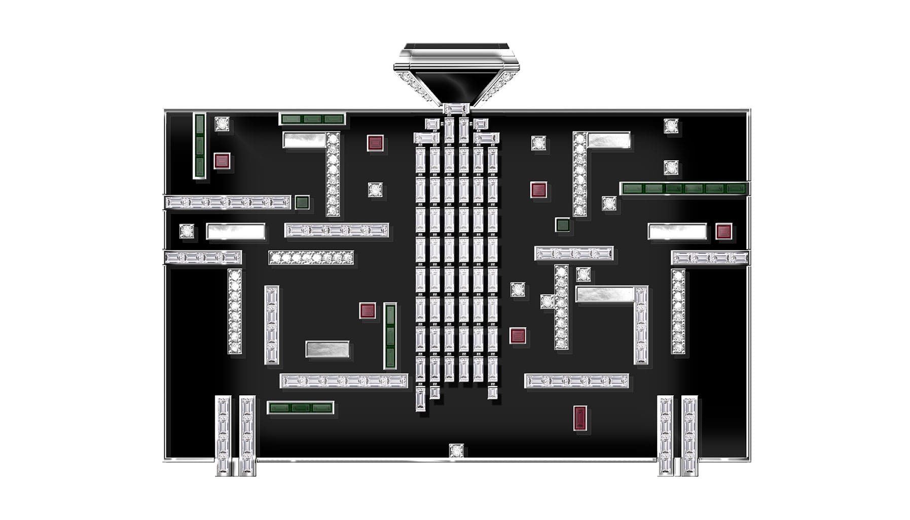 The New York Companion high jewellery clutch is Harry Winston’s tribute to the heydays of its birth city. On the 18-carat white gold outer shell, a black glossy lacquer represents the inky darkness of night and acts as the perfect backdrop for the gems, which are arranged to mimic the lights and skyscrapers of the Big Apple. Eight baguette-cut rubies, 21 baguette-cut emeralds and 281 diamonds, set alongside mother-of-pearl panels, convey the bright lights of the city. A diamond skyscraper runs down the centre of the clutch, topped by a crown of black onyx. In this crown is a fabulous secret: swivel it to reveal a hidden dial, with which the time can be read discreetly.