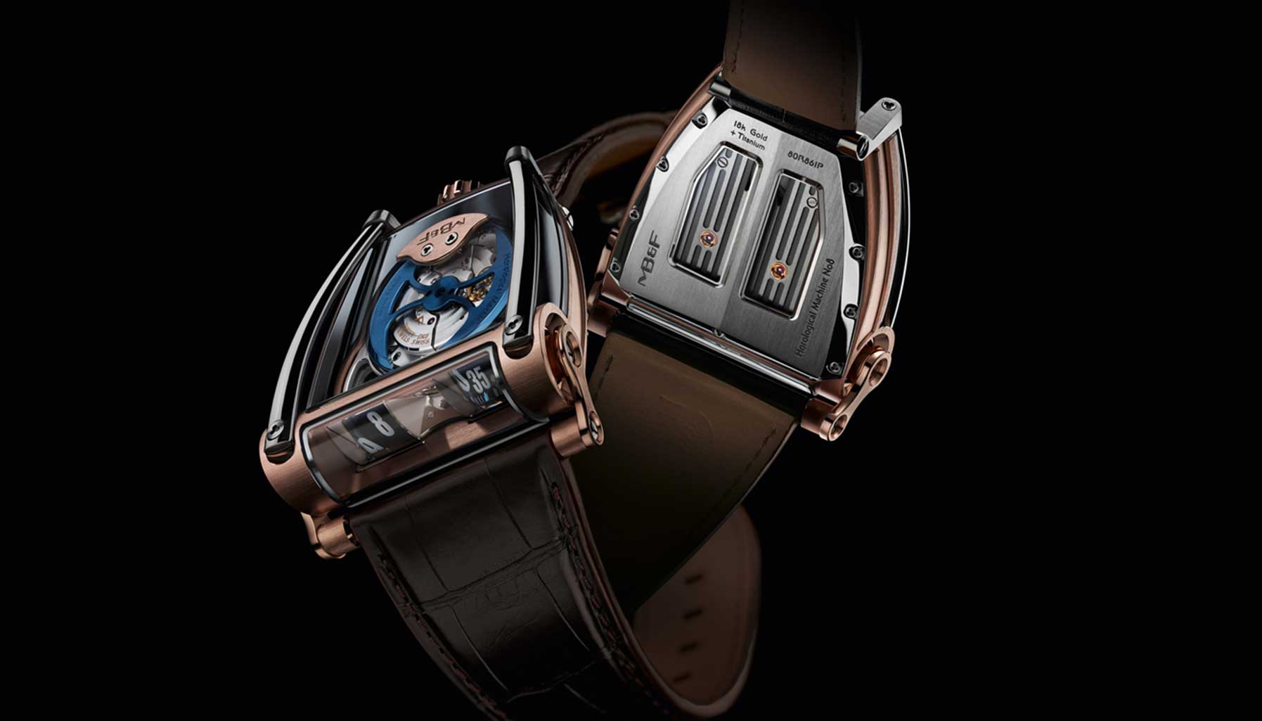 The Sowind base movement that powers HM8 has been modified to accommodate an in-house module containing two discs that display the bi-directional jumping hours and trailing minutes through two wedge-shaped sapphire crystal prisms. Considerable expertise was required to manufacture the crystals, which are designed to reflect light rather than refract it. A convex lens at the front magnifies the indications.