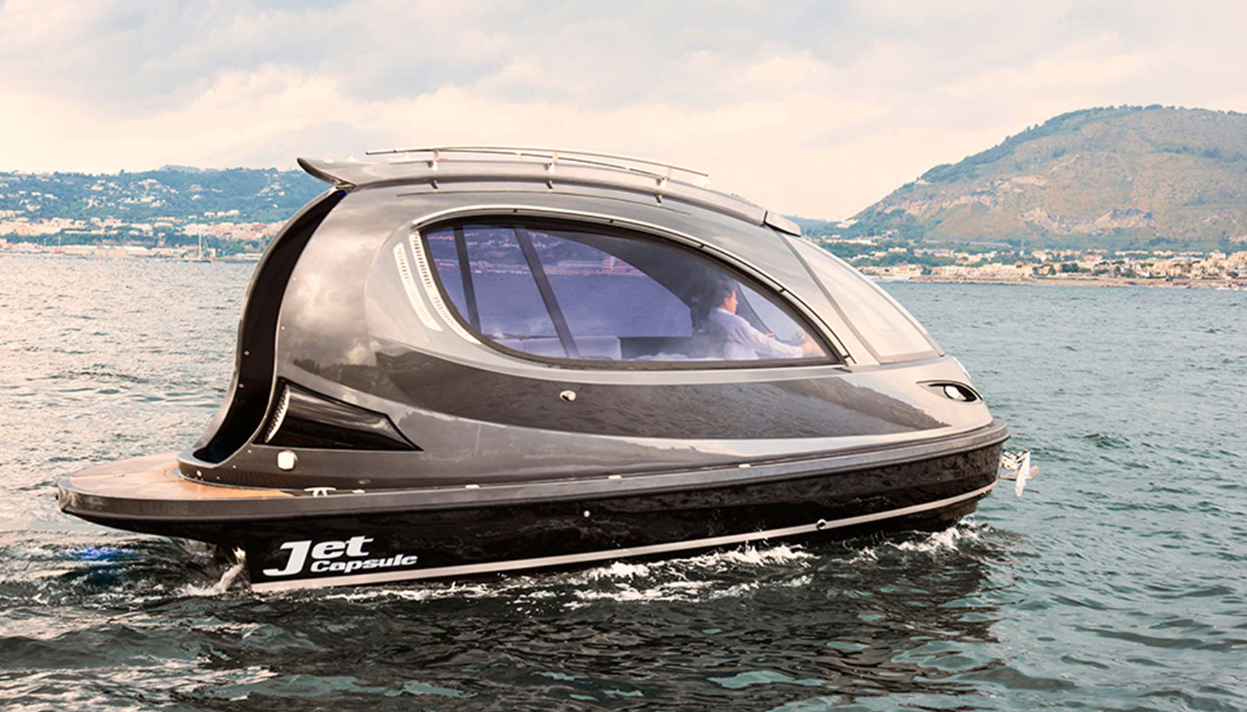 A watercraft with character, the Jet Capsule appears more like a pelagic pod plopped down from its intergalactic mothership than a boat built in Italy. Designed by Pierpaolo Lazzarini, the high-tech transport is fashioned mostly from carbon, features a V-shaped hull, and can carry single or double engine options (paired with hydro-jet propulsion) totalling up to 520 hp for a maximum speed of 50 knots.