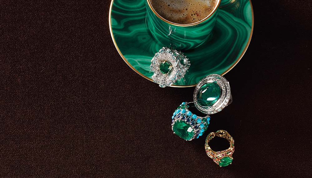 From bottom: Fabergé Zambian-emerald ring with diamonds, rubies, tsavorites, and sapphires; Piaget emerald ring set in white gold with emeralds, sapphires, and turquoise; Robert Procop 34.39-carat emerald ring set in platinum with diamonds; Dior white- and yellow-gold emerald ring with diamonds and tourmalines; L’Objet Malachite espresso cup and saucer.