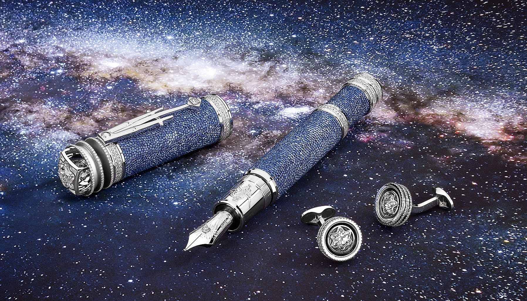 The shining star of the collection is the Stella Nova Limited Edition 1 (priced at US$1.5 million), a one-of-a-kind piece bedecked in 570 diamonds and 5,294 sapphires arranged to evoke the Milky Way in the night sky. Crowning the achievement is a 6.2-carat Montblanc-cut diamond that rests on the pen’s cap and is surrounded by three diamond-set rings representing, once again, Kepler’s three laws. To ensure that your look is as unified as Kepler’s theories, the pen is accompanied by a pair of cufflinks shaped like the scientist’s model of the solar system.