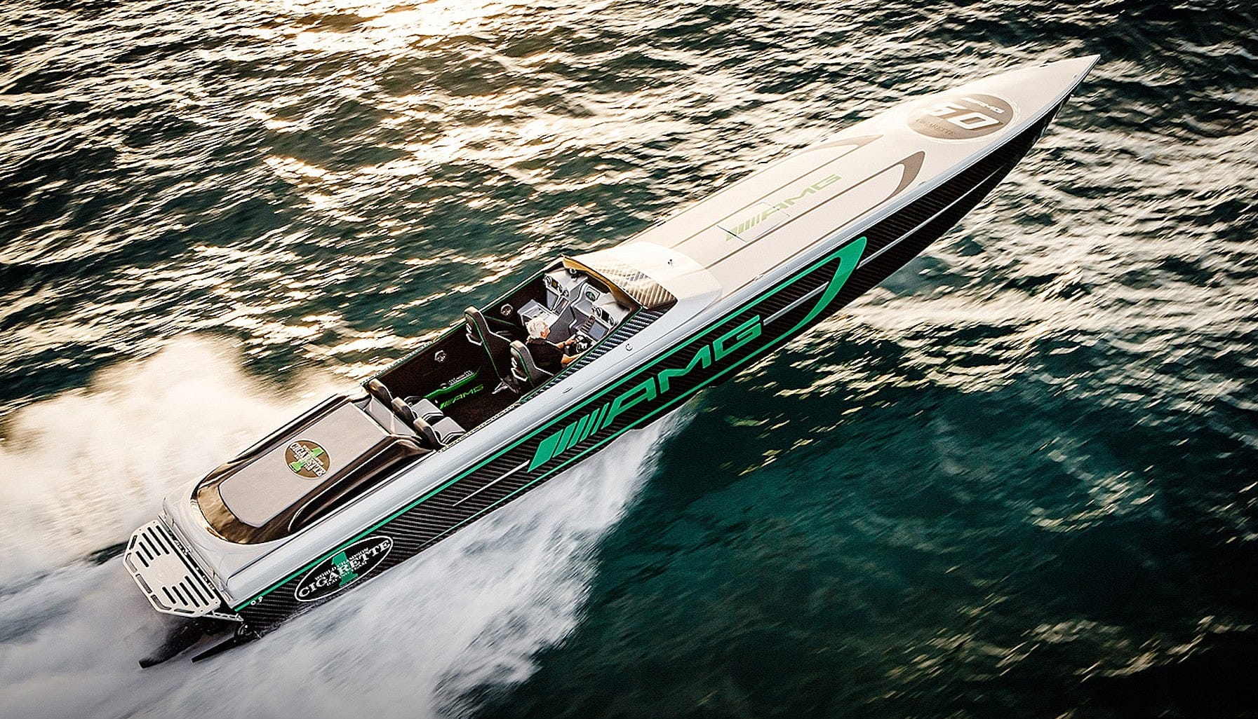 Streaking across the water at 193 kph in an open-cockpit boat is one of the most exhilarating – and terrifying – rides anyone can experience. Doing it in the wrong boat, with the wrong driver, could be a disaster. Riding in Cigarette Racing Team’s new 50 Marauder AMG powerboat with pro driver Jeff Ware, however, was a no-fear adrenaline rush that climbed with the speed, surging from 128 to 160 kph, then leaping to 193 kph. To sweeten the experience, Gorden Wagener, chief designer for Daimler AG, was in the seat next to Ware, clearly having the ride of his life.