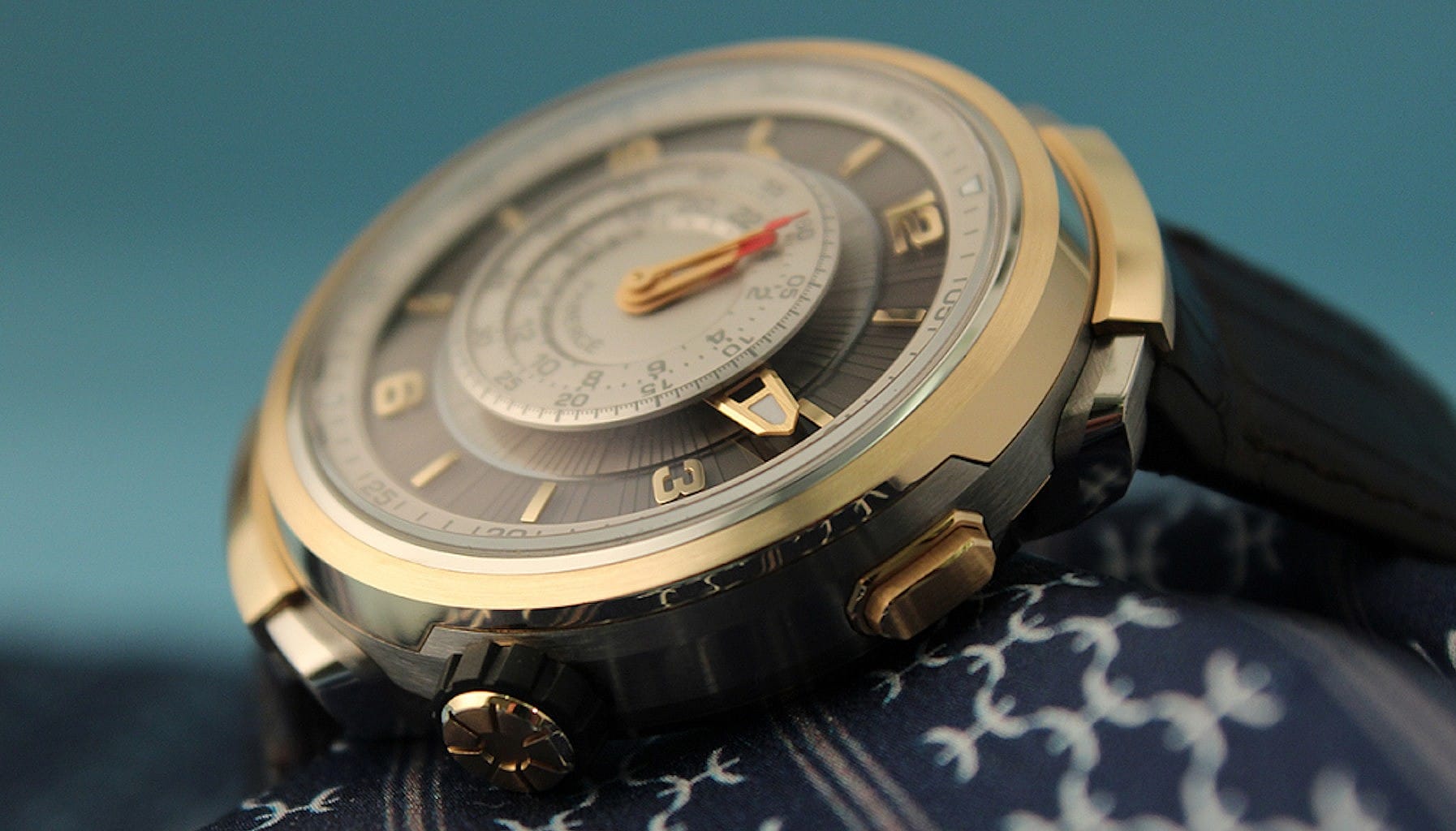 Retaining the same design DNA as last year’s Visionnaire DTZ, the chronograph will look rightfully foreign to you unless you have seen its older sibling. A hooded lug case design and bullhead pushers at 10 o’clock and 2 o’clock make it instantly stand out from anything conventional, but that’s just the beginning. Golden hour indices rest on a smoked sapphire outer dial that partially reveals the movement’s winding rotor. A pair of wide and stubby hands provide time indication on this outer track in relatively conventional form (other than the entire length of either hand not being visible). From there, what we can only refer to as a significantly proportioned central subdial takes up the bulk of the under-the-crystal real estate, providing indication for the chronograph. Once you are accustomed to its design, the Visionnaire Chronograph is one of the most easy-to-read chronographs on the market, adding a layer of practicality to its unique design aesthetic.