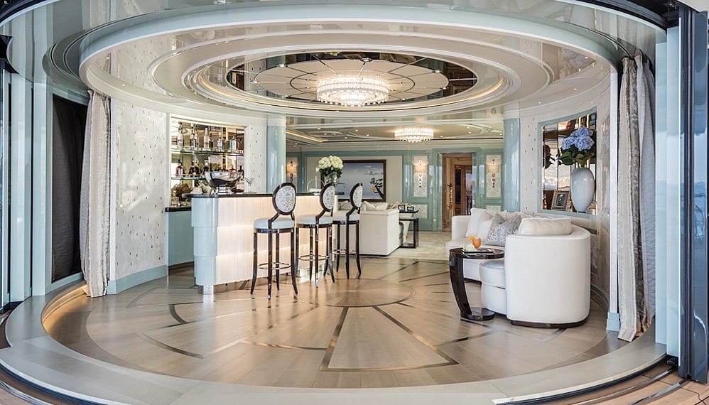 The main entrance to the interior is through a starboard door, leading into a circular lobby adorned with a mosaic artwork made with slivers of six different marbles by Magma in Sicily and designed by the Winch team. A remarkable 21 types of marble were used throughout the vessel to create veined-stone variations that lend an air of natural elegance. The lobby opens to the main saloon, where dramatic pillars were handlaid with Moon gold leaf, giving them a metallic iridescence. Ivory velvet upholstery by Pozzoli adorns the sofas, while bleached curly-maple panels line the walls. The silk-and-wool carpet here, as well as in several of the other rooms, was a bespoke collaboration between Winch Design and Tai Ping.