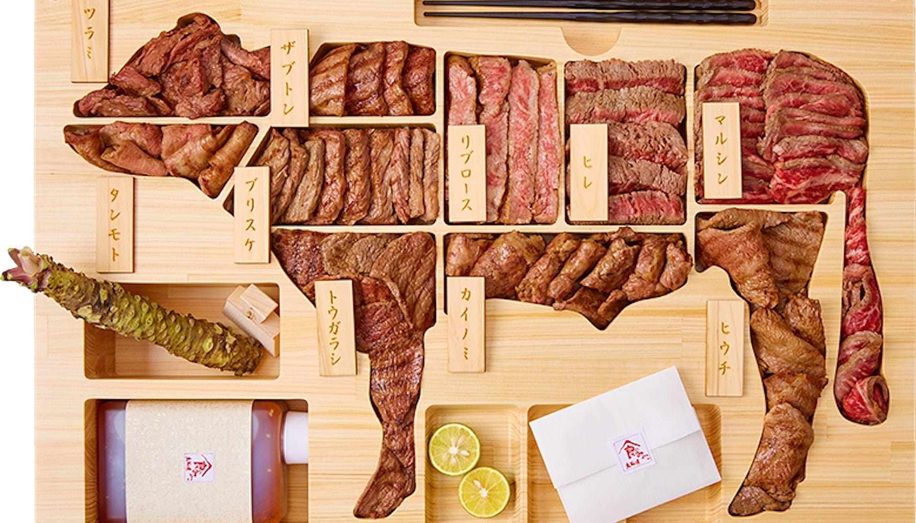 As if playing a delicious game of Operation, buyers can gather around the box to pluck cuts of beef from the corresponding section of the cow’s body. Prime rib, sirloin, brisket, tongue, and more are perched atop sticky rice sourced from the same prefecture and served alongside raw wasabi, lime, and yakiniku sauce, which is made from Asian pear. Released to celebrate Japan’s Meat Day, this is a far cry from the typical Japanese housewife-made simple bento. But it sure beats an UberEats.