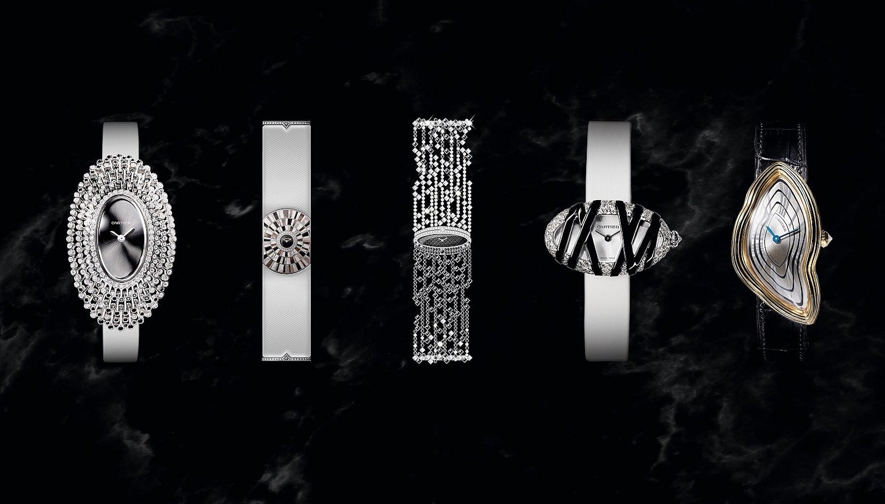 Four of the watches bear the ‘Baignoire’ prefix. French for ‘bath,’ the original Baignoire dates from 1906 and is — you guessed it — an elegant, classic dress watch with an oval shape. The Libre collection Baignoires, however, share an oval theme, but are rather avant-garde and striking with their black-and-silver theme. The Debordante (‘overflowing’) sports a near-unmarked black face but is ringed with a mane of gems. The Infinie (‘endless’) is a cleanly-cut bracelet with a tiny watch dial surrounded by a dazzling array of diamonds and mother-of- pearl. The Etoilee (‘starlit’) features a horizontally-oriented dial and a chandelier-like bracelet of dozens of diamonds and black spinels. The Interdite (‘forbidden’) is likewise horizontally set, but the case is wrapped with bold black strips that, if you look closer, resemble roman numerals.