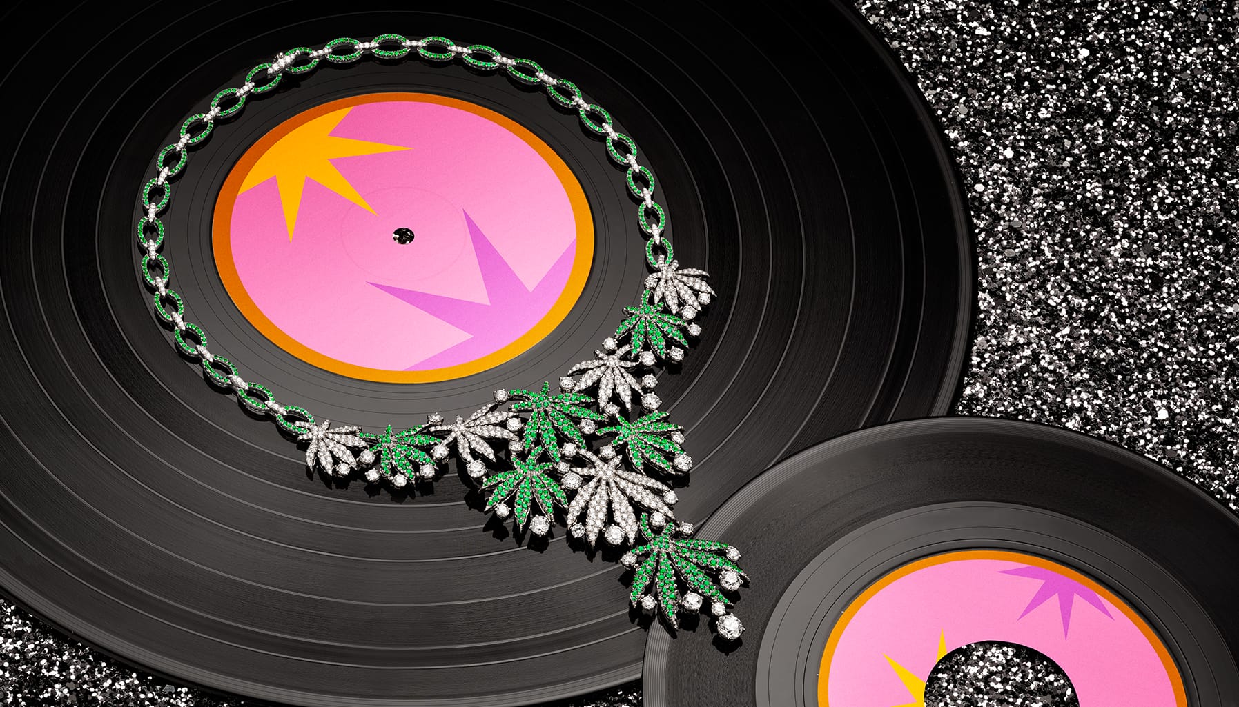 The entire 1980s distilled into one high jewellery collection, Wild Pop brings sumptuous coloured stones in Bulgari’s favourite cut – cabochon – and turns them into the most imaginative pieces in modern jewellery design. Breaking all the rules in the book, the collection turned up David Bowie-inspired lightning flash necklaces and bracelets and gorgeous ruffles on emerald drops, futuristic geometries and a little bit of old Roman flavour. There are also odes to the world of pop music with coloured cabochon- cut stone masquerading as microphones lined up to form necklaces or bracelets, black onyx and diamonds arranged like piano keys to encircle the neckline, and black onyx cut into flat round discs to evoke the era of spinning turntables and vinyl records.
