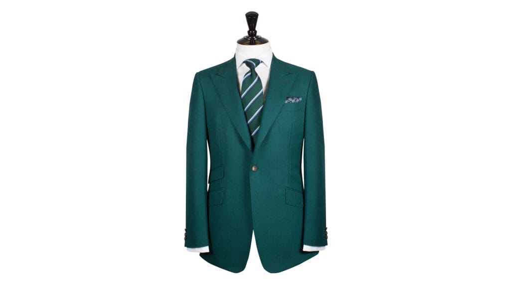 Richard Anderson’s racing green jacket (made-to-measure from £1,800/RM9,485, or handmade bespoke from £3,860/RM20,340) is crafted from extra-fine, two-ply merino ‘Mockleno’ wool. Woven and finished in Yorkshire on a standard loom with warp threads, it has a crisp, grey handle, which means it’s a highly breathable piece. Not for nothing is it called Tropical Weave – this blazer is easy to wear whatever the climate, whether you’re in Kuala Lumpur or Europe. The one-button front is accentuated with a peak lapel and slanting pockets with an out ticket pocket.