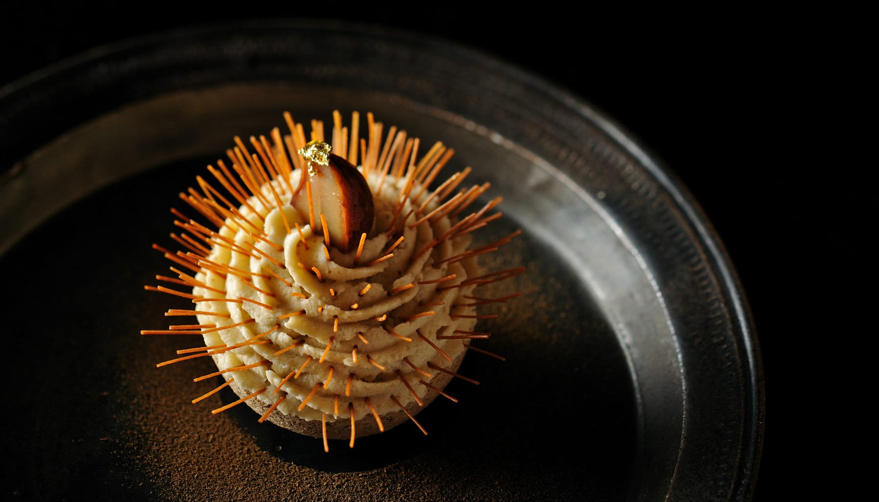 The chef’s signature Five Flavours of Delight appetiser sets the tone for the stunning nine-course meal. Five bite-sized morsels — Japanese barracuda and daikon roll, mushroom soup pop, saury risotto croquette with chrysanthemum leaf powder, tuna with hot green pepper sauce, and weatherfish and pumpkin cream mont-blanc — representing the five flavours (sour, salty, bitter, spicy and sweet) are served on individually chilled or heated stones.