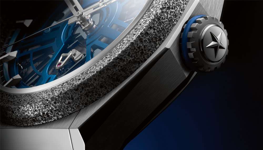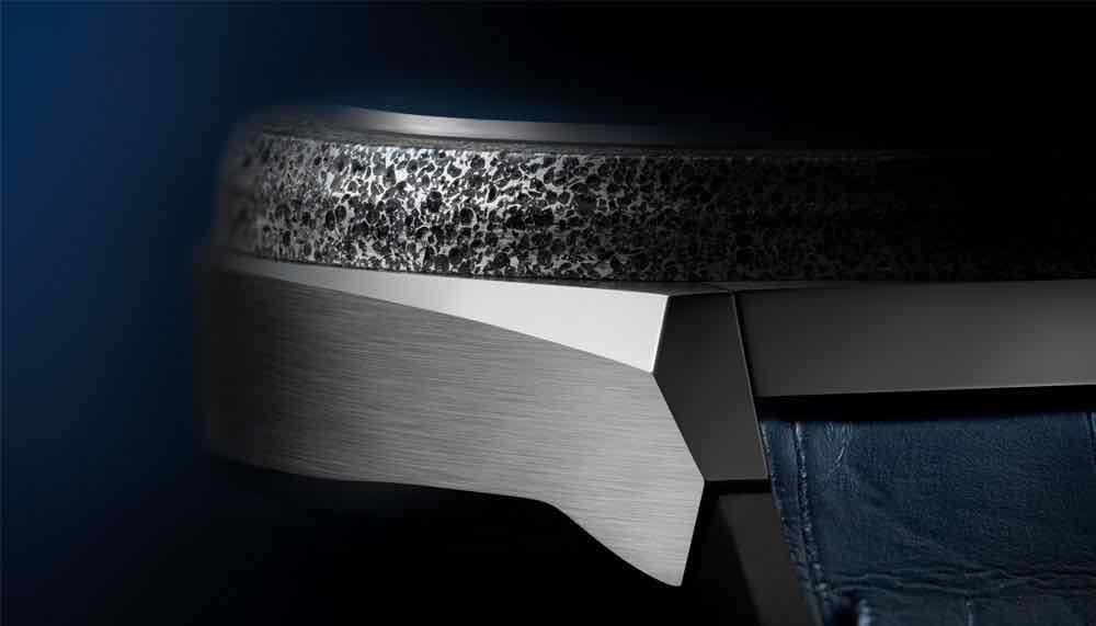 But the marvels don’t end there. The Defy Inventor’s 44mm case is fashion out of titanium with a textured Aeronith bezel. This advanced material is an open-pore aluminium foam stiffened with a polymer, resulting in a composite that’s three times lighter than titanium. This exceptional and disruptive piece of technology is a powerful statement of capability from the award-winning Swiss luxury manufacturer.