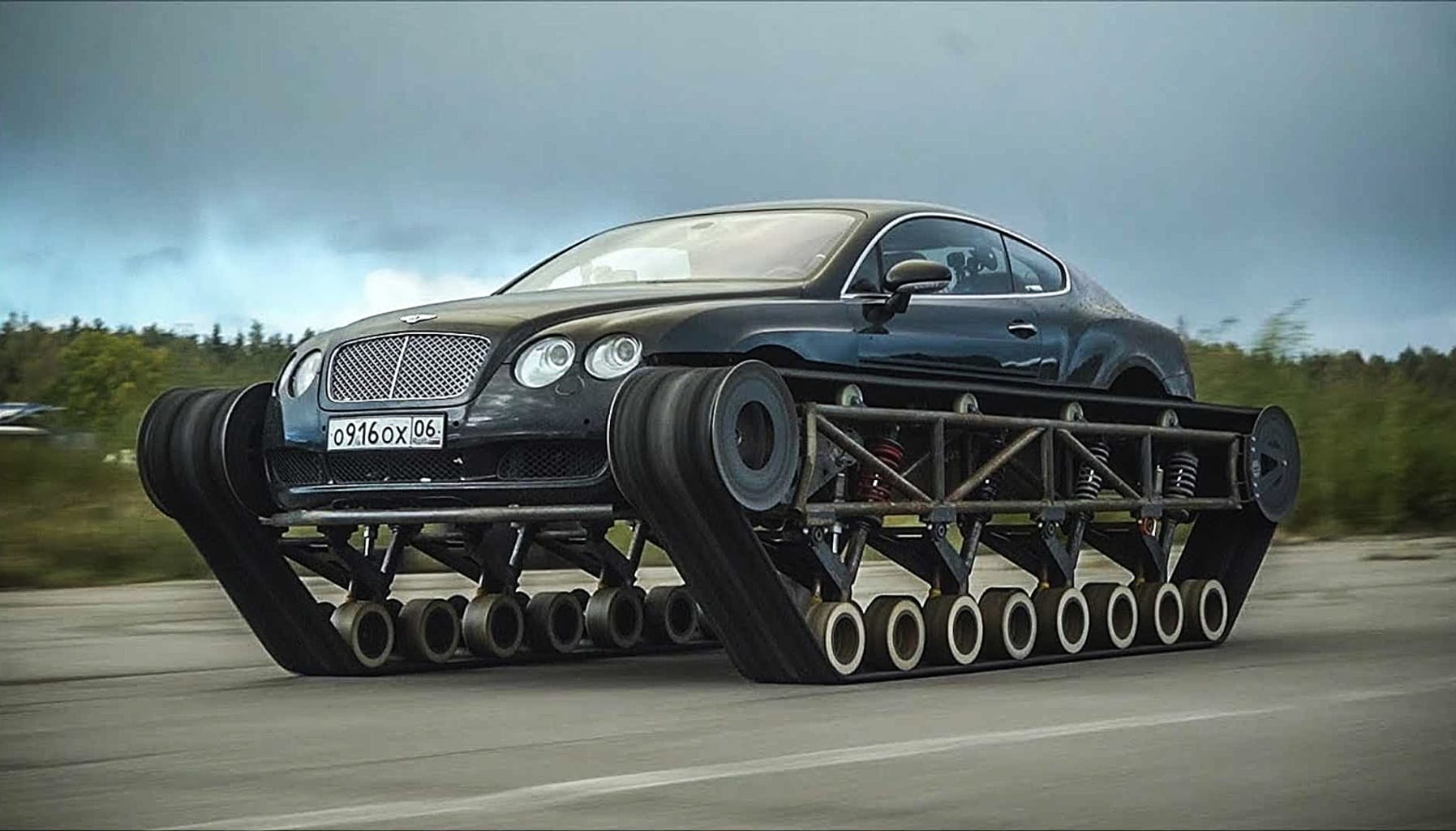 According to GQ magazine, AcademeG nabbed the cheapest Bentley Continental GT they could find—one with a broken frame, a busted gearbox and a W12 engine in need of both turbos replacing—and set to work switching the car’s wheels with caterpillar tracks.