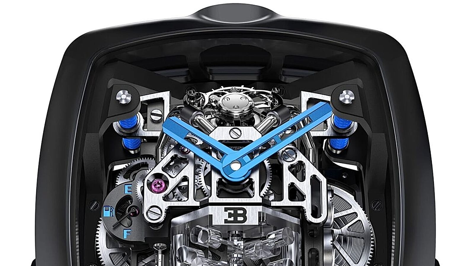 Bugatti’s singular automotive vision of record-breaking engineering audacity needs a watchmaking partner of similar ambition and creativity, one unafraid of being a little over-the-top. There are few that fit the bill as aptly as Jacob & Co. Last year, the partnership saw its maiden outing with two special edition watches of existing design, but 2020 sees a brand-new timepiece created specifically to honour Bugatti’s current flagship, the Chiron. As a reminder: the Chiron is record-breaking a two-seater sports car, one that sports an 8.0-litre 16-cylinder engine capable of nearly 1,500bhp and a top speed electronically limited to 420km/h—and one that surrenders very little in terms of luxury, as well. It is a physics-defying combination of unabashed decadence, artful intelligence and sheer muscle.
