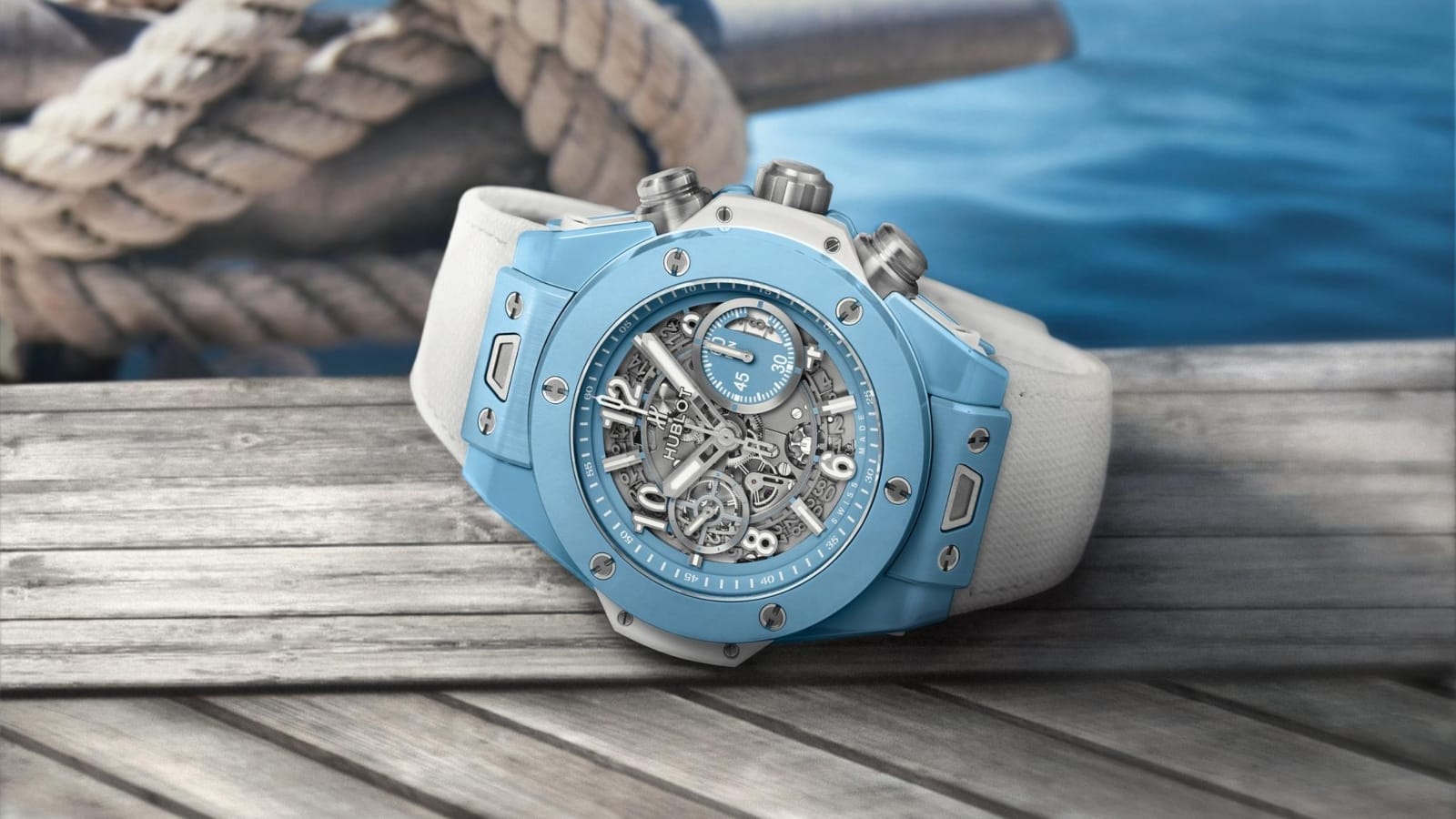 With a case and bezel made of polished and satin-finished light blue ceramic as well as a skeleton dial in a matte blue colour scheme, the 45 mm timepiece is the quintessential summer watch, perfect for clocking a tanning session on the beaches of Mykonos, Ibiza or Saint-Tropez.