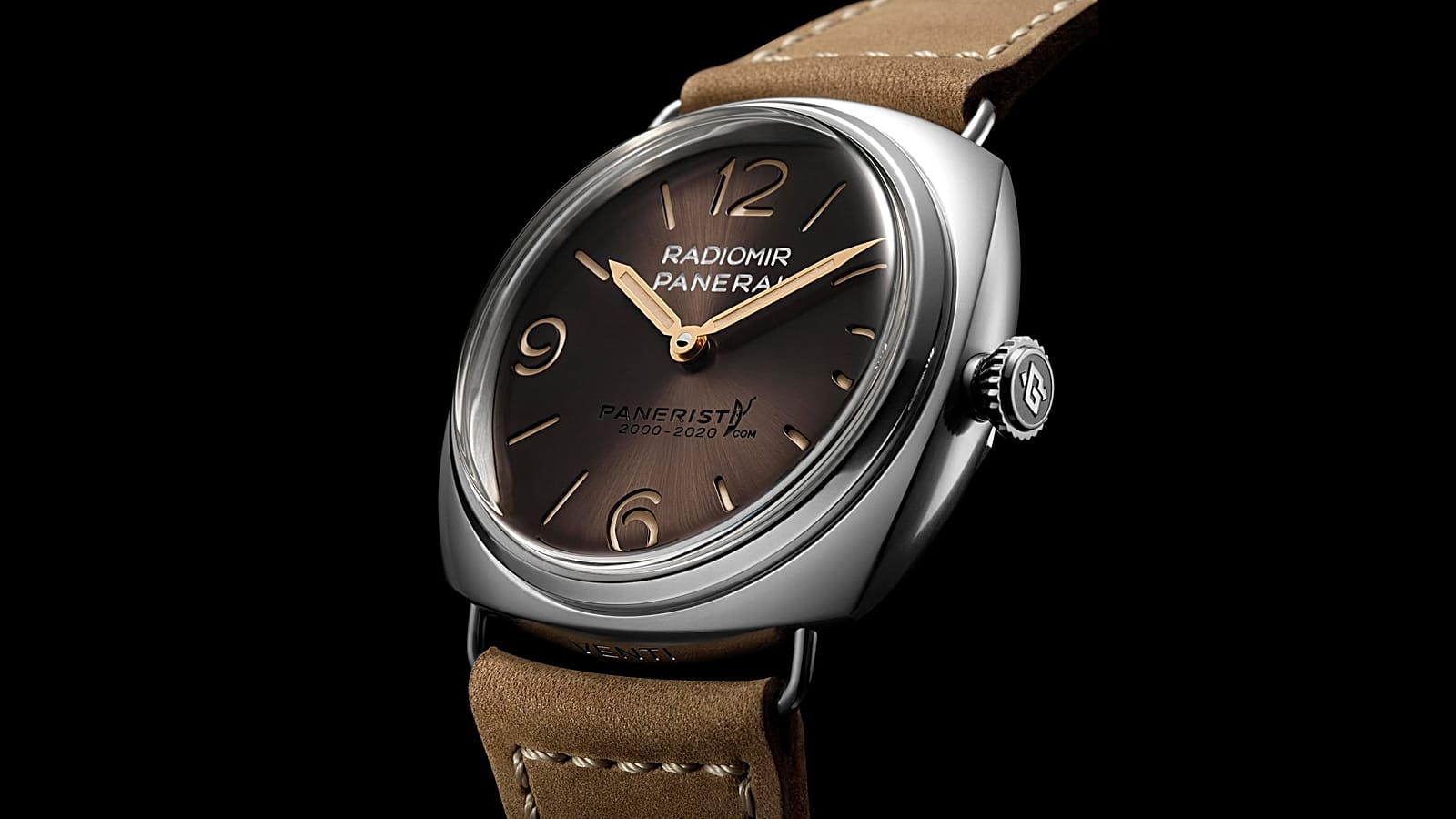 Setting that aside, the Venti is a lovely concoction that incorporates a cognac-coloured radially brushed sandwich dial with beige lume inside a classic stainless steel Radiomir case with a light brown calfskin strap. The Paneristi.com logo and “2000-2020” at 6-o’clock are in black against the cognac dial, giving the co-branding a subtlety that, I assume, many will find more tasteful than if it had matched the white “Panerai Radiomir” logos at 12-o’clock.