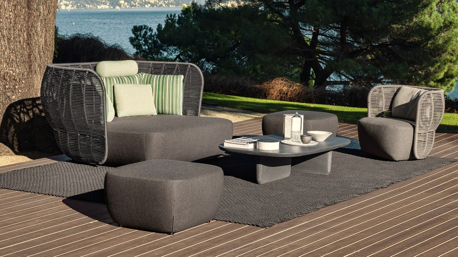 Meanwhile, Bay by Nipa Doshi and Jonathan Levien provide a sensuality to the outdoors with the use of braided, sculptural furniture where padded seats and soft cushions provide an elegant counterpoint to the monolithic designs.