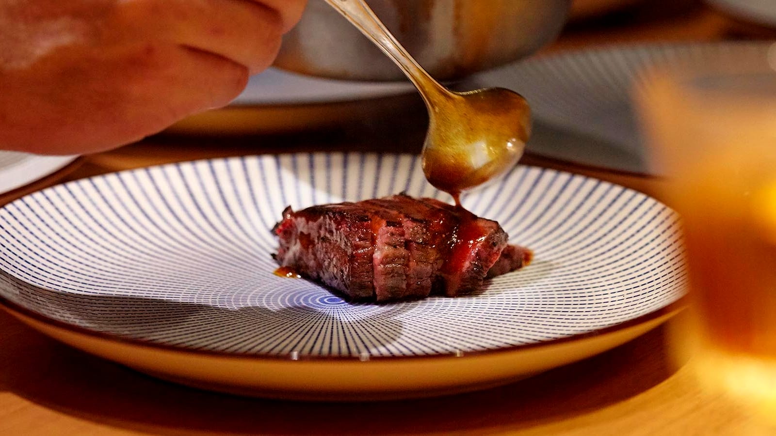 But it’s the next three courses that really drive home the message of just how superbly talented Timmermans is: first, a piece of steamed Scottish cod blanketed in a silky, sensual mentaiko emulsion, kombu butter, and a sheet of laver. A pear – burnt, blackened, and blended – becomes the gritty accompaniment to a confited quail leg, draped with forest-green dinosaur kale and sprinkled with lightly fried capers for crunch. Wagyu flank from Queensland’s Darling Downs, marinated in kōji for 12 hours, acquires burnt caramel aromas and a sensational tenderness while retaining the cut’s characteristic bite, making it a joy to eat with tamari brown butter sauce and purslane.