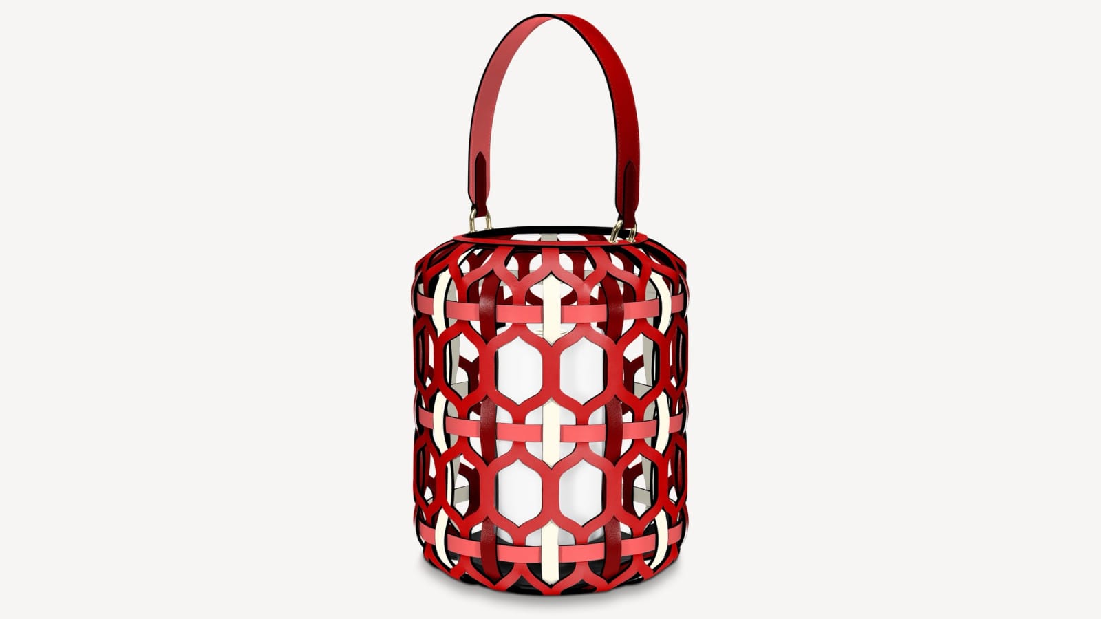 The duo’s latest addition to the collection is an extension of their experiments with leather weaving that began with their original Objet Nomade, the elaborate Mandala Screen. Each lantern is carefully constructed with interwoven strips of Louis Vuitton leather to create a honeycomb-patterned cage. Its blown glass light dome creates delicate shadows against the soft pistachio or red berry tones, casting a warm, romantic light to set the ambience for any occasion.