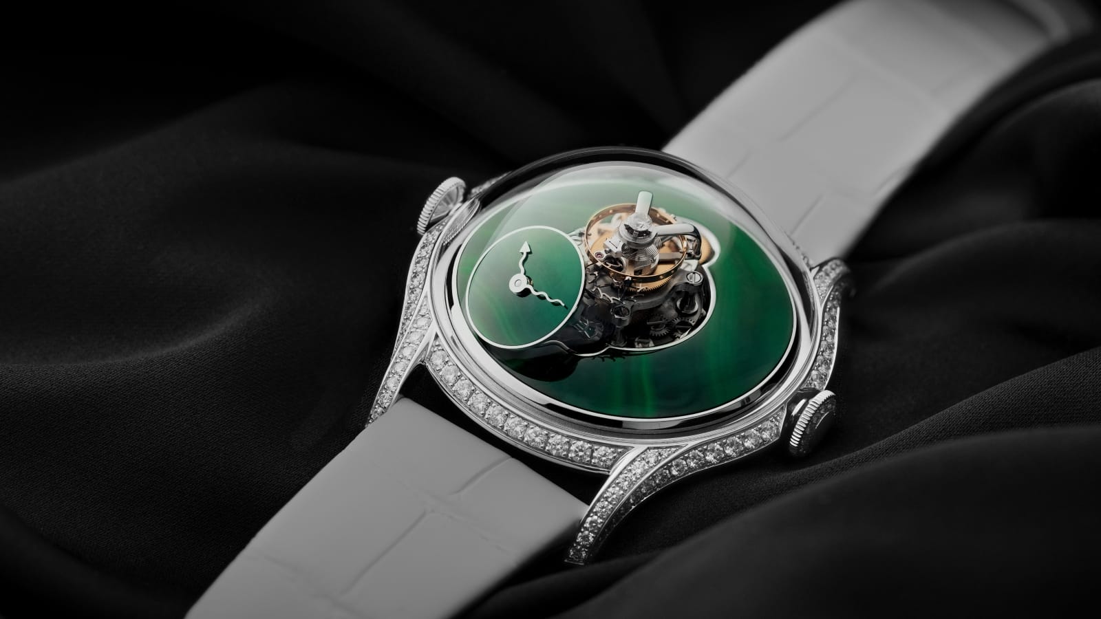 The case is 18-karat white gold or platinum, and measures a very wearable 38mm. In order to display the time as precisely as possible on the 50-degree inclined dial, conical gears were used to optimise the transmission of torque from one plane to another, a solution used in previous MB&F watches. The movement has an impressive 100-hour power reserve. The band of malachite surrounding the tourbillon and set into the hour disk is a variation on previous models. The original 2019 non-diamond-pavé model had a black lacquer dial plate, and 2020 versions included guilloché, diamond and lapis lazuli dial plate options. No matter which way it comes dressed, it is a striking piece that looks unlike anything else on the market. And with its six-figure price tag, it will belong to the rarefied few.