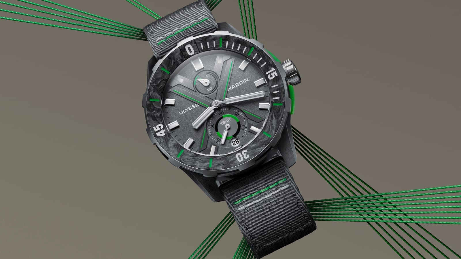 Ulysse Nardin may have just crafted one of the cleanest dive watches you’ll ever see. No, we’re not referring to the brand-new Ocean Race‘s design—although it does look pretty sharp—but rather the materials it’s made from. That’s because Ulysse Nardin‘s latest timepiece is constructed almost entirely of recycled and upcycled materials. Nearly every element of the Ocean Race Diver is in its second life. The 44mm case is made from recycled stainless steel taken from cars. Its flanks and caseback, meanwhile, utilise a mixture of Carbonium, a carbon composite made from the recycled material found in aircraft fuselages and wings, and Nylo, a polyamide derived from fishing nets. The timepiece’s bezel insert is made from Carbonium and it features an all-new strap made from yarn also derived from recycled fishing nets. The watch and its dial, which is based on the Diver Net concept watch from 2020, are covered in green accents. Whether that’s a nod to its eco-conscious design and construction is up for interpretation.
