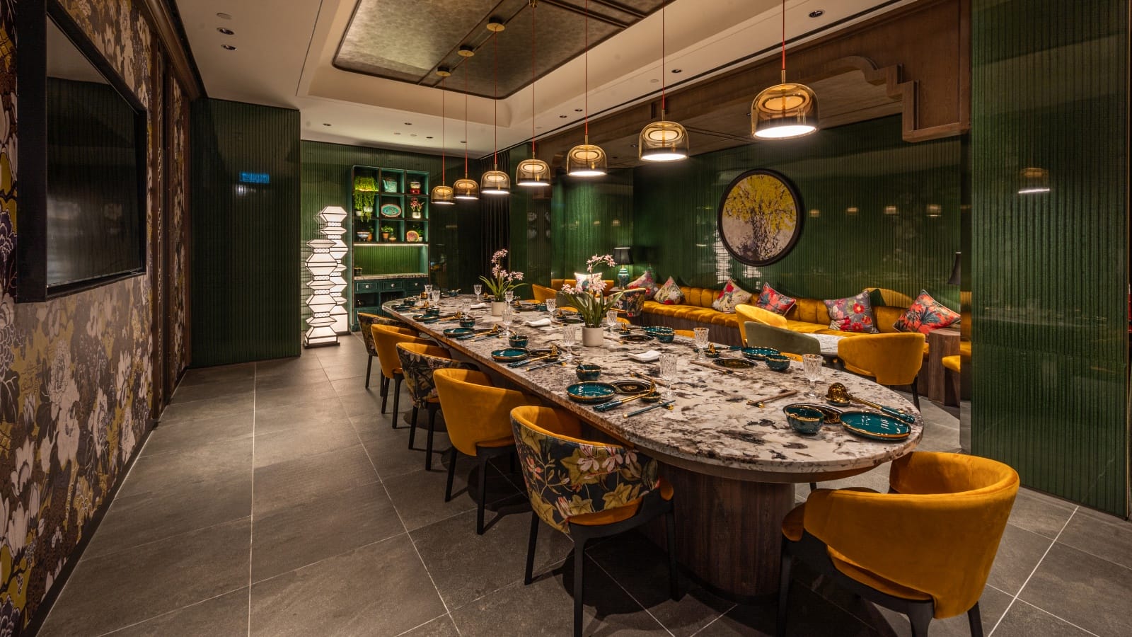 RasaNya, fitted out across nine months and at a cost of over RM3 million, welcomes guests into an ambience which recalls a modern heritage Peranakan dining room. Here, you find wooden interiors with deep emerald accents, ornate floral wallpaper (with matching upholstery) and copper-tinged chandeliers and ceilings. A private room for up to 20 diners features a dining equipped with individual cooking surfaces for steamboat pots. This lavishly thought up private dining space includes a seating area, ensuite, private entrance and also a giant television for karaoke or presentations.