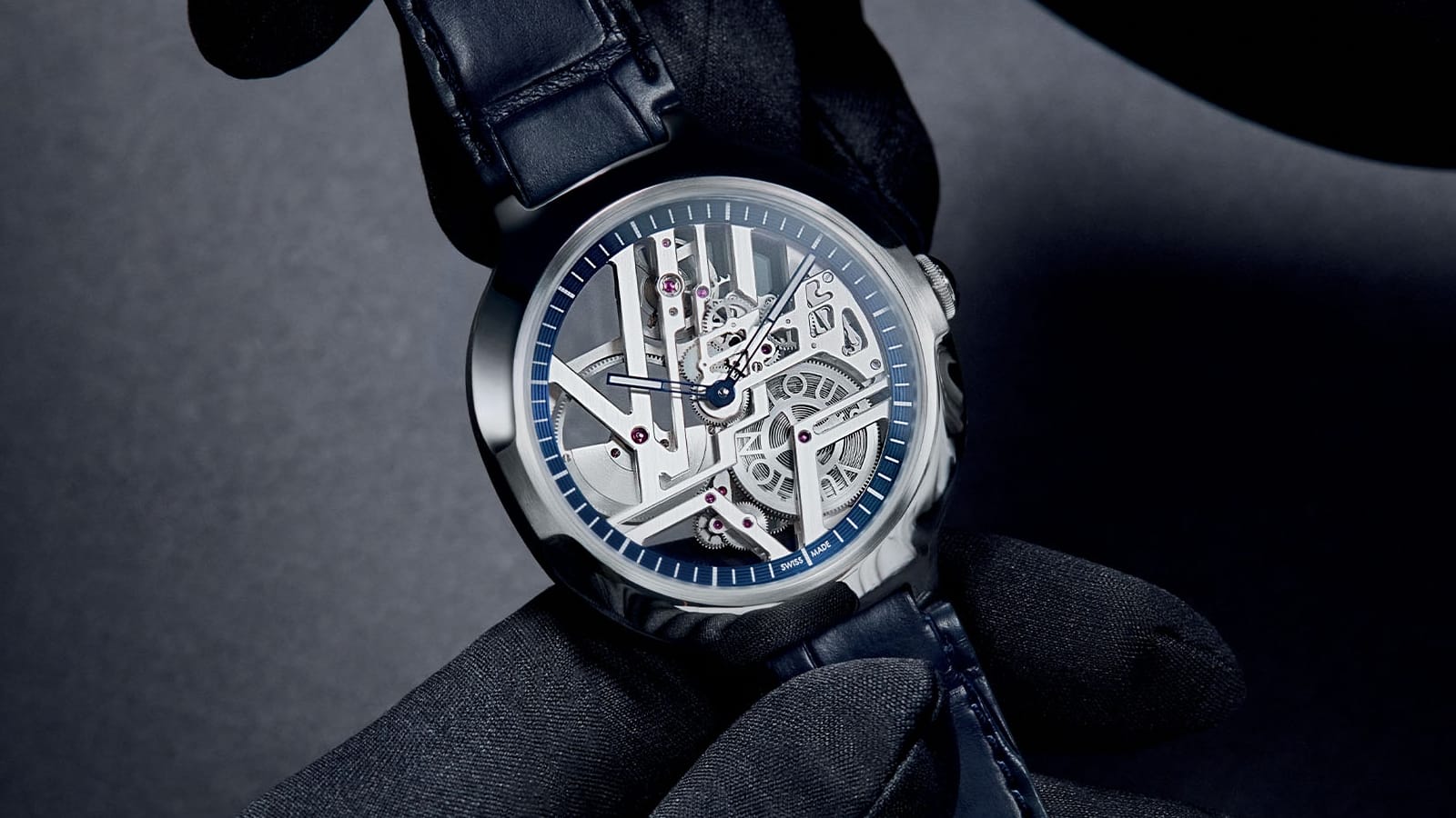 As in the watches mentioned above, the movement for the Voyager Skeleton is purpose-built, developed exclusively for this watch, with technology firmly in the service of design. The feat of the Voyager Skeleton is its artful “bones.” The trick to creating openworked calibres is to eliminate just enough of the interior metal to open it up without compromising structural integrity. Its creativity lies in the way that the structure is conceived. In this case, the calibre LV60 echos the architecture of the Frank Gehry-designed Fondation Louis Vuitton in Paris, an angular, geometric style that is also reflected in several Louis Vuitton flagship stores.