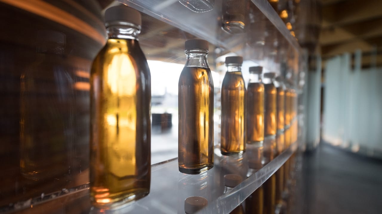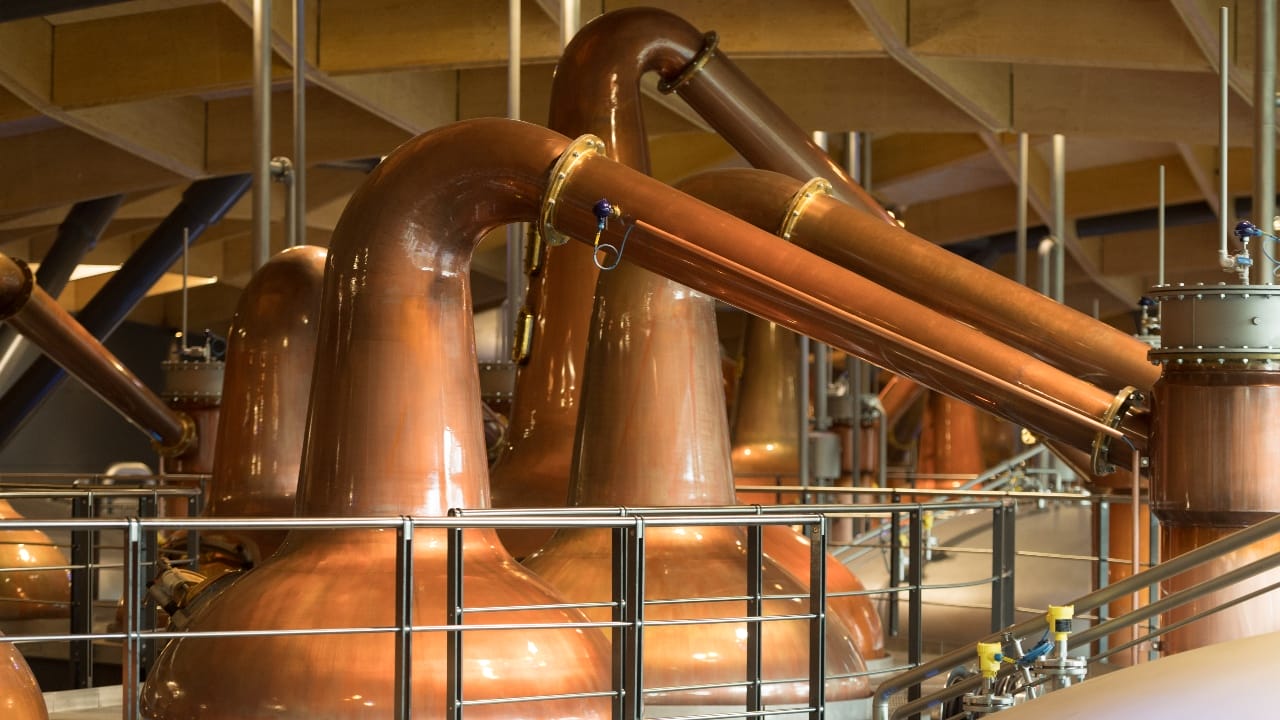 Opening the door to the production side invites a blast of heat—distillation involves boiling, after all—and the full spectrum of floral, fruity, and malty fragrances that are a signature of whisky-making. Visitors are welcome to inspect the process on a series of upper walkways that function as a viewing gallery—and stills aside, the entire process is indeed housed here. One can observe malted barley being ground into grist before being soaked in water in the mash tun—from which the castoff is processed as biofuel to provide some of the building’s energy—and then pumped into steel washbacks where they can ferment before finally being sent to the stills.