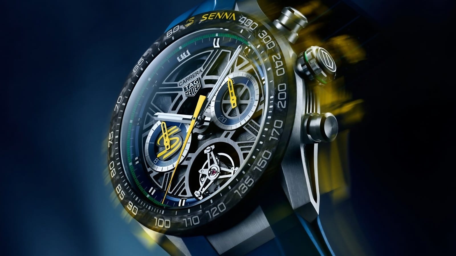 The Carrera Chronograph Tourbillon x Senna also delivers on the technical front. The architectural open-worked dial offers a glimpse into the watch’s high-performance engine—the automatic Calibre TH20-09, a COSC-certified movement housing the two namesake complications, while promising up to 65 hours of power reserve. Paired with a durable blue rubber strap, it’s as watch that exudes performance and power, perfectly reflecting the spirit of Ayrton Senna.