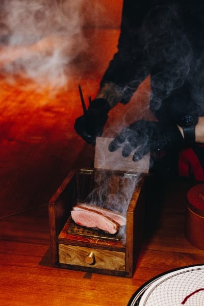 The Irish smoked duck then comes with a wild berry sauce, sesame seeds and smoked cream, presented on a grill of binchotan. Meanwhile, the jumbo carabinero—the largest prawns in the world—are carefully smoked on the binchotan, before it is plated on a bed of Japanese cucumbers with its roe or milt turned into a sauce garnished with yuzu.