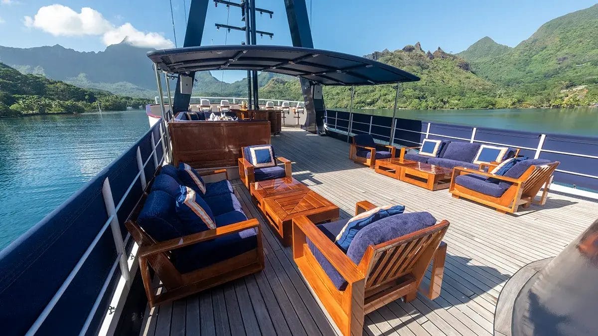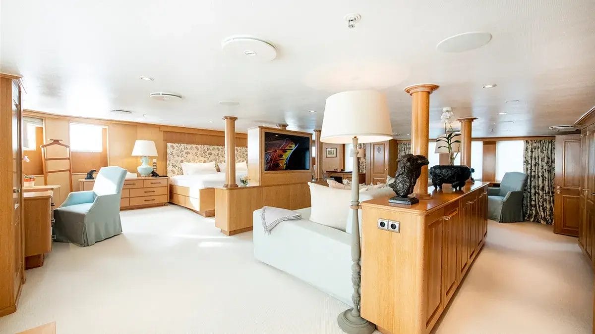 Following five extensive refits, the steel-hulled behemoth is looking better than ever. The expansive interior showcases high-end materials and finishes, resulting in a superyacht feel. The living quarters feature seven suites for up to 12 guests, as well as a cinema, a gym, and other wellness facilities.