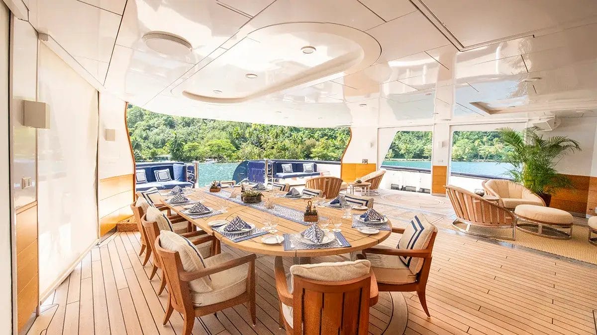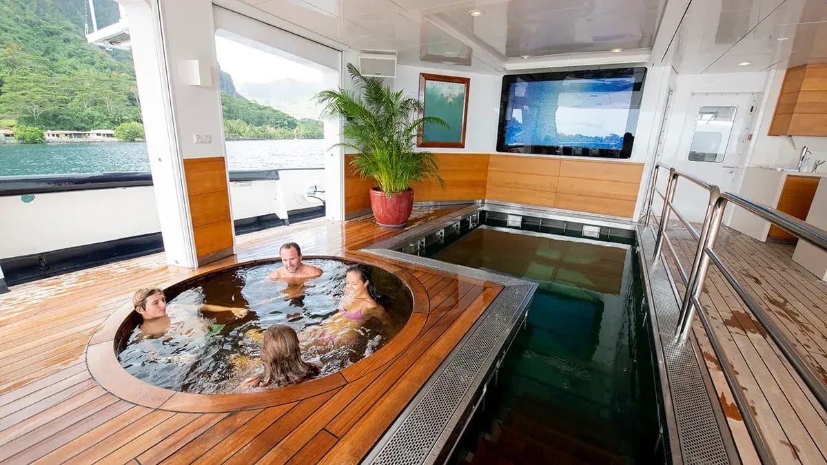 The vast exterior decks, some of the largest of any charter yacht, can be used for relaxing, entertaining, or adventure. The helideck, for example, doubles as a dance floor, yoga space, and alfresco dining area. Another highlight is the adjustable-depth pool and Jacuzzi, which can be enjoyed in all seasons.