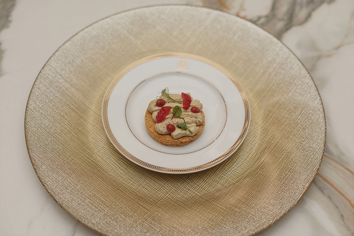 While the first pour offered immediate appeal, the 2020 Cheval des Andes impressed with its deep, velvety red fruits, peppery spice, and full-bodied structure that felt pleasant on the palate with each sip. Known as the Grand Cru of the Andes, this wine represents a cultural fusion between Château Cheval Blanc’s winemaking tradition and Mendoza, Argentina’s high-altitude vineyards. Here, under challenging climatic conditions, malbec, cabernet sauvignon, and petit verdot come together in a distinctive blend at the foot of the Andes mountains. This diverse complexity was paired with a creamy linguine dish with roasted garlic foam and crisped chicken skin, alongside smoked foie gras mousse on brioche crisp.