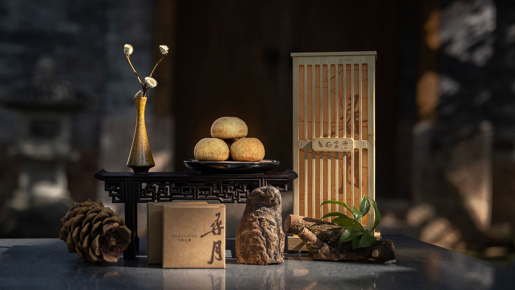 Aman’s four distinct destinations across China each present a uniquely curated mooncake gift box that draws upon the rich heritage of their respective locales. One of which comes from the group’s Amandayan Resort in Lijiang, where Naxi culture and snow mountain spirituality reveal a mooncake gift box that embodies highland craftsmanship and sustainable design. Emulating a lamp, the box is carved with vertical patterns and traditional Dongba pictographs that appear alongside Chinese characters, creating a meaningful cultural dialogue. The gift box also transforms into a functional table lamp after use, filtering warm light through bamboo slats in an elegant expression of the resort’s commitment to sustainable luxury.