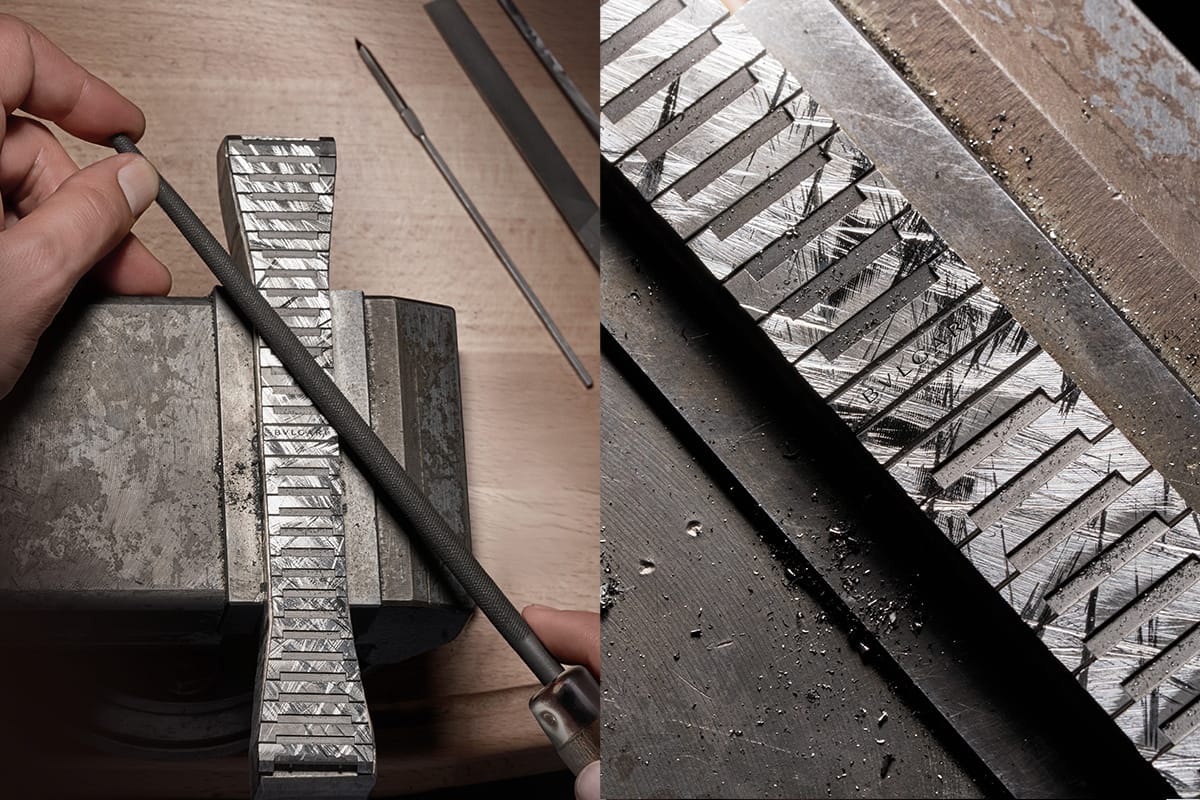 This led to the idea of creating something brand new on the Octo Finissimo, a rough finishing that made a statement about raw materials. Buonamassa Stigliani began experimenting, right at his desk, on the Octo Finissimo’s titanium bracelet. “I was in love with the idea of creating a hand-made finishing on the bracelet and case. That’s why I made the first prototype by myself—my desk was full of titanium powder everywhere! But I found the idea amazing, and I immediately started sharing with Lee,” he says. The result is the Octo Finissimo’s structural signatures—titanium bracelet and 40mm case—hand-marked, and roughened and made raw by artisans following Buonamassa Stigliani’s process. The contrast comes in the form of the mirror-effect dial—a placid sleekness, a counterpoint, topped by black hands.