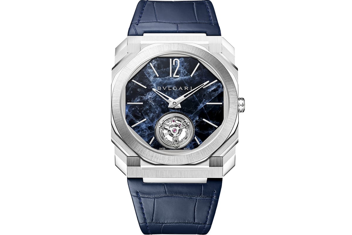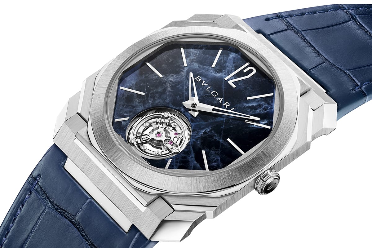 Limited to 30 pieces, the Octo Finissimo Marble Tourbillon holds a manually wound flying tourbillon movement that was the world’s thinnest of the type when it was launched in 2014. The watch is less than 6mm in depth, and it is delivered on a blue alligator leather strap.