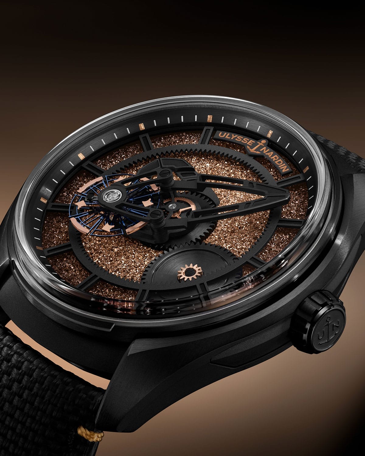 Ulysse Nardin’s Freak should need no introduction—it has been turning heads since 2001, a paragon of flashy, fascinating mechanical watchmaking, consisting of a carousel movement that rotates once every 60 minutes and, thus, acts as its own hour hand. The Freak X, introduced in 2019, is Ulysse Nardin’s slimmer, somewhat simpler take on the complication—though all key elements, including silicon balance wheel, are still present—and it now bears witness to a new decorative methodology.