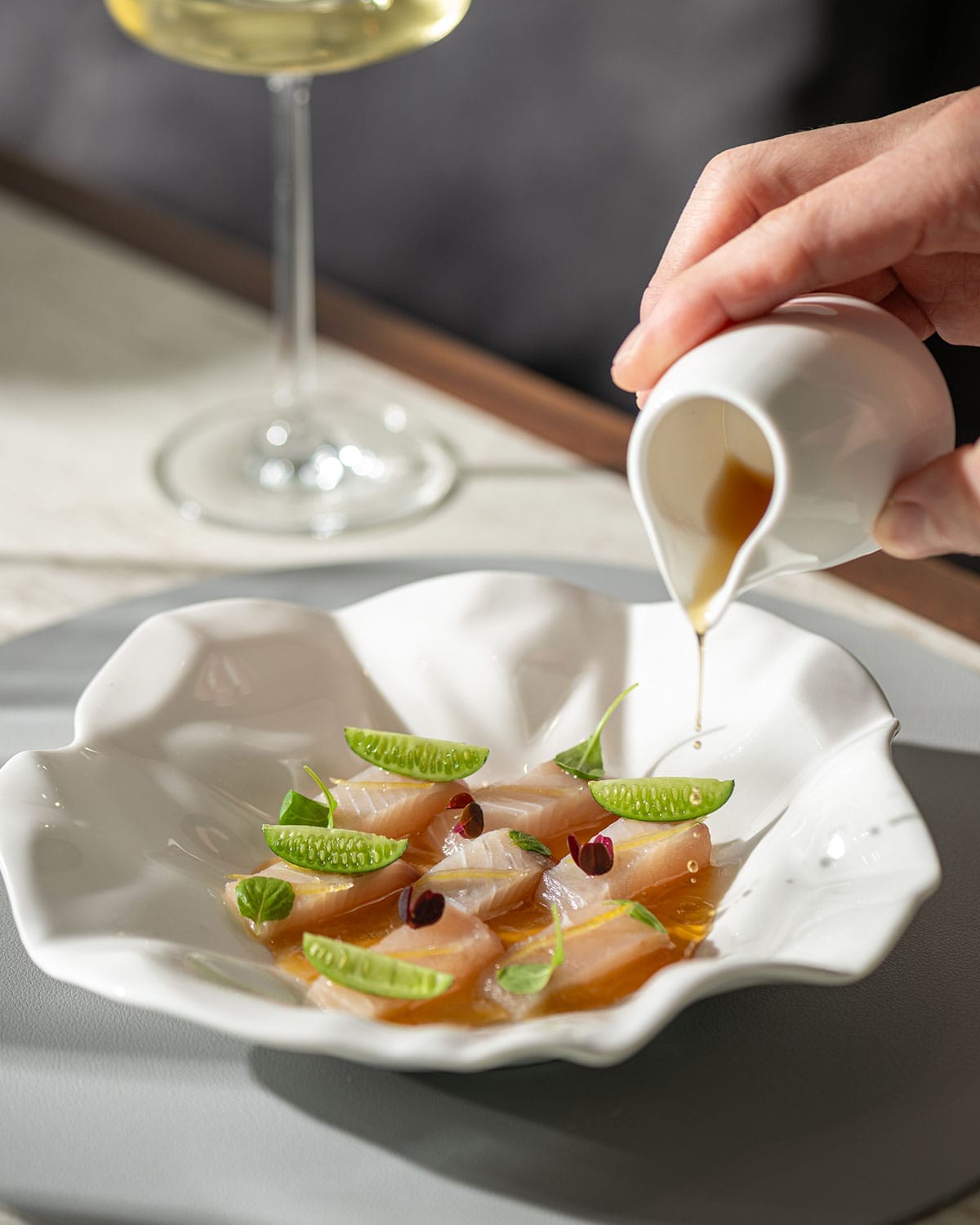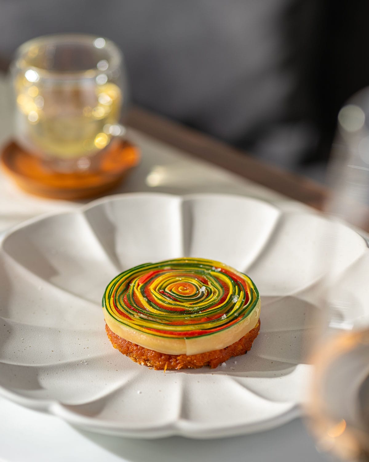 The menu continues with a classic Ratatouille En Fleur, featuring courgettes and bell peppers. But what elevates this French staple to the next level is the cold drink that accompanies it, made using clarified tomato juice infused with black tea, giving it a crisp yet smoky depth. Each bite is best enjoyed with a sip of the drink to fully appreciate the layers of flavours in this dish.