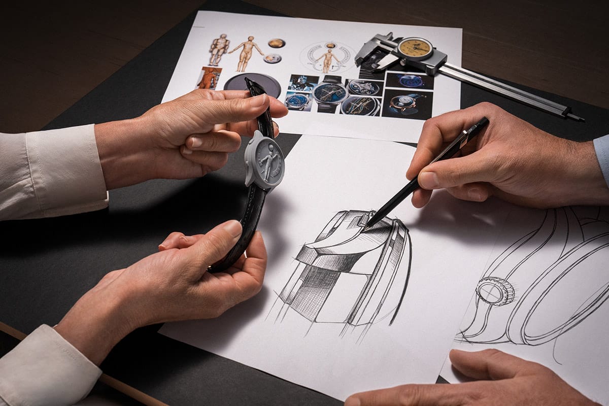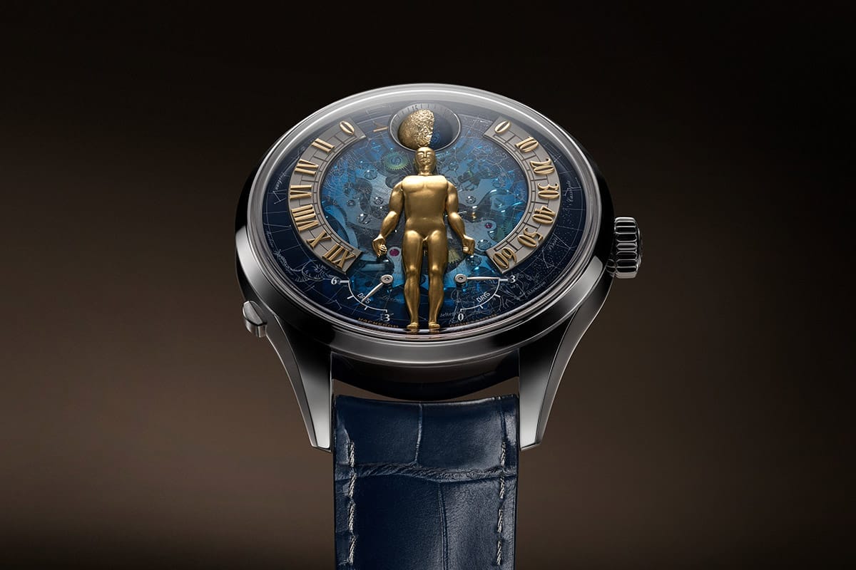 The hand-wound Calibre 3670 consists of 512 components and has a few serious tricks up its sleeve. Its calling card is that the retrograde displays, wherein the figure’s arms act as indicators, can be set to display continuously, as in a typical indicator. It can also be set to only show time on demand, where each activation of the pusher at 10 o’clock will briefly awaken the figure from a rest state. It also has three barrels, providing a power reserve of six days. This is quite an impressive feat, considering that the movement ticks at 5Hz, and the dual-mode retrograde displays take a lot of torque to function.