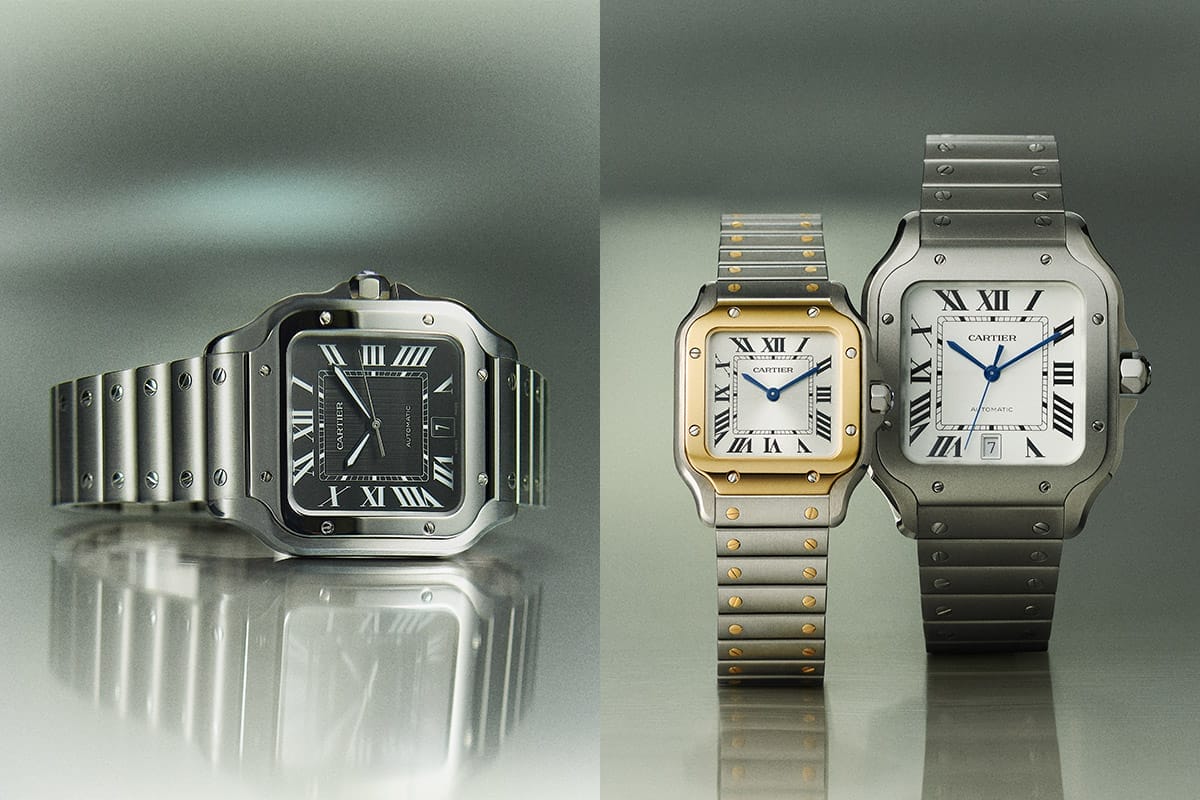 The two new watches seamlessly adopt the ultra-lightness of titanium and the phosphorescent Super-LumiNova, introducing aesthetic and technical choices that reinforce the emblematic Santos de Cartier design. The titanium watch boasts a lighter and sturdier frame, with the black spinel of the winding crown and the anthracite of the fully bead-blasted matte-finish material bringing out the depth of its colour. For the large all-steel model, the watch showcases a sporty theme with its black dial and railway track motif. The watch hands are coated in a fluorescent Super-LumiNova green, further enhanced by the dial’s finishes and by the heptagonal crown set with a faceted blue synthetic spinel and a satin-finished case.
