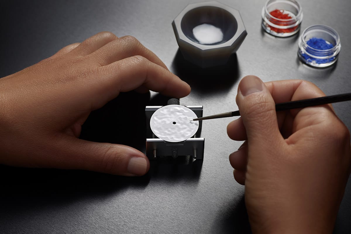 The updated timepieces employ the traditional art of grand feu enamelling, a painstaking process prized for its long-lasting quality finish and exceptional vibrance that lasts for generations. The process required 20 hours of labour to apply multiple layers of vitreous enamel to a white gold base, which is then fired up repeatedly at temperatures of up to 900 degrees Celsius, where the minutest flaw would mean starting all over again. The finishing process required the preparation of the white dial for enamel vitrification, where it was slowly fired at 720 degrees Celsius for a total of 10 successive rounds. This resulted in a strong, permanent bond between the enamel and the substrate, and a subtle opaline glow of remarkable depth and purity.