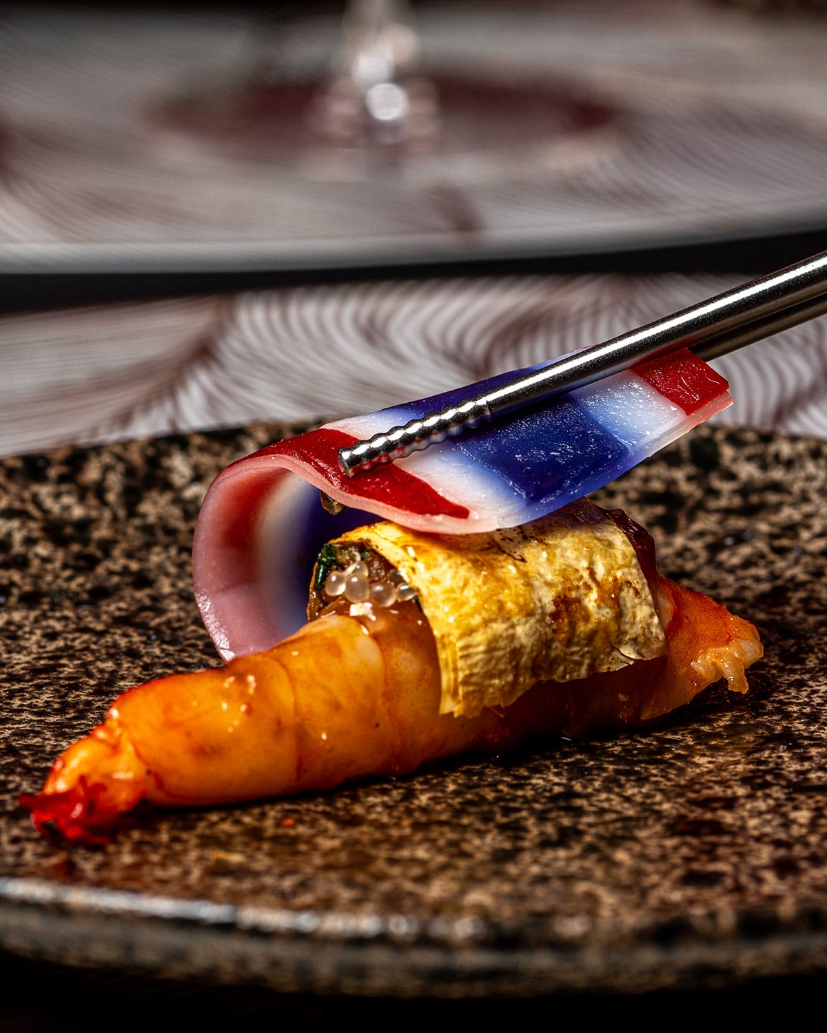 The dish transforms a humble street dish into a fine-dining experience. The Pad Thai features a tiger prawn (sourced locally for the Penang version) and silky rice noodles naturally tinted in the colours of the Thai flag. Two bites were enough to release a burst of layered flavours from the tang of fermented radish, the briny depth of dried shrimp, and a punch of umami from the shrimp shot.