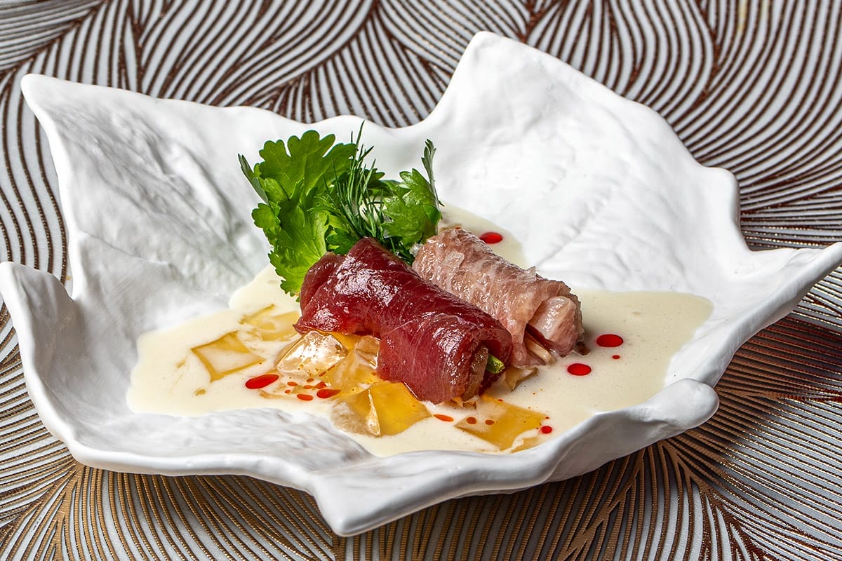 The dish transforms a humble street dish into a fine-dining experience. The Pad Thai features a tiger prawn (sourced locally for the Penang version) and silky rice noodles naturally tinted in the colours of the Thai flag. Two bites were enough to release a burst of layered flavours from the tang of fermented radish, the briny depth of dried shrimp, and a punch of umami from the shrimp shot.