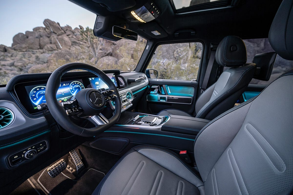 The quad motors allow some clever things to happen. There is no need for a traditional differential here—instead, torque vectoring is the order of the day, responding within fractions of a second to deliver the correct amount of power to each wheel for any given situation. This means better stability and accuracy during cornering, and no need to manually engage differential locks when going off-road—the vehicle can respond automatically. Off-road capability remains paramount: the traditional ladder frame of the G Class has been tweaked and reinforced for the electric generation, and is outfitted with a 26mm underbody panel to protect the battery. The ground clearance is 250mm, with a maximum fording depth of 850mm. The 360-degree cameras can field a ‘transparent bonnet’ function, allowing drivers to see underneath the front of the vehicle. The intelligent off-road crawl function lets the driver set a target speed over rough terrain, freeing them to focus on steering and obstacle awareness.