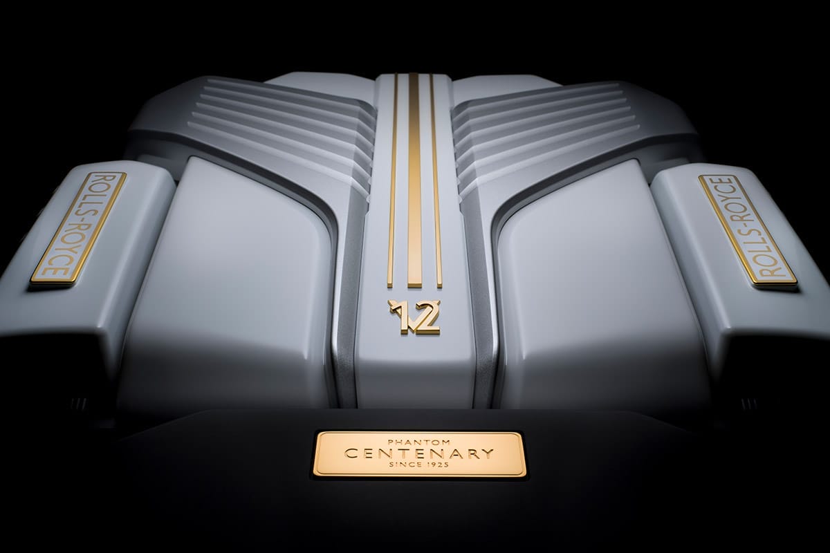 The 6.75-litre V-12’s specially designed engine cover is finished in Arctic White and detailed with shiny 24-karat gold.