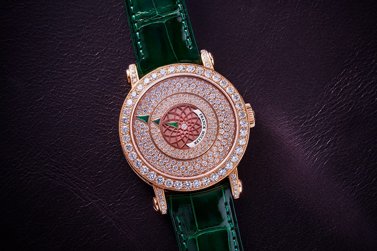 The trilogy is complete. The Triple Mystery is the third step in the evolution of Franck Muller‘s Mystery watches. The first contained a single rotating disc that displayed the hour only. Two years later, the Double Mystery was introduced, which added a second rotating disc for minutes. Now, a third rotating disc indicating seconds comes to the Triple Mystery. Adding this third disc wasn’t as simple as one might assume, as its rapid rotation warrants significant power while also ensuring precision. Thus, the entire seconds disc is skeletonised, made of aluminium, and weighs just 0.052g—including a 0.003g diamond. The Round Triple Mystery is 39mm in diameter, 10.05mm in depth, and is available in an 18-carat rose gold or a white gold case. It has a bidirectional automatic movement, and 42 hours of power reserve. The case is hand-set with 120 brilliant-cut diamonds, while the dial is also hand-set with 237 brilliant-cut diamonds. In addition, the Round Triple Mystery has a variation featuring a case with 80 brilliant-cut diamonds as well as 48 baguette-cut diamonds on the bezel.