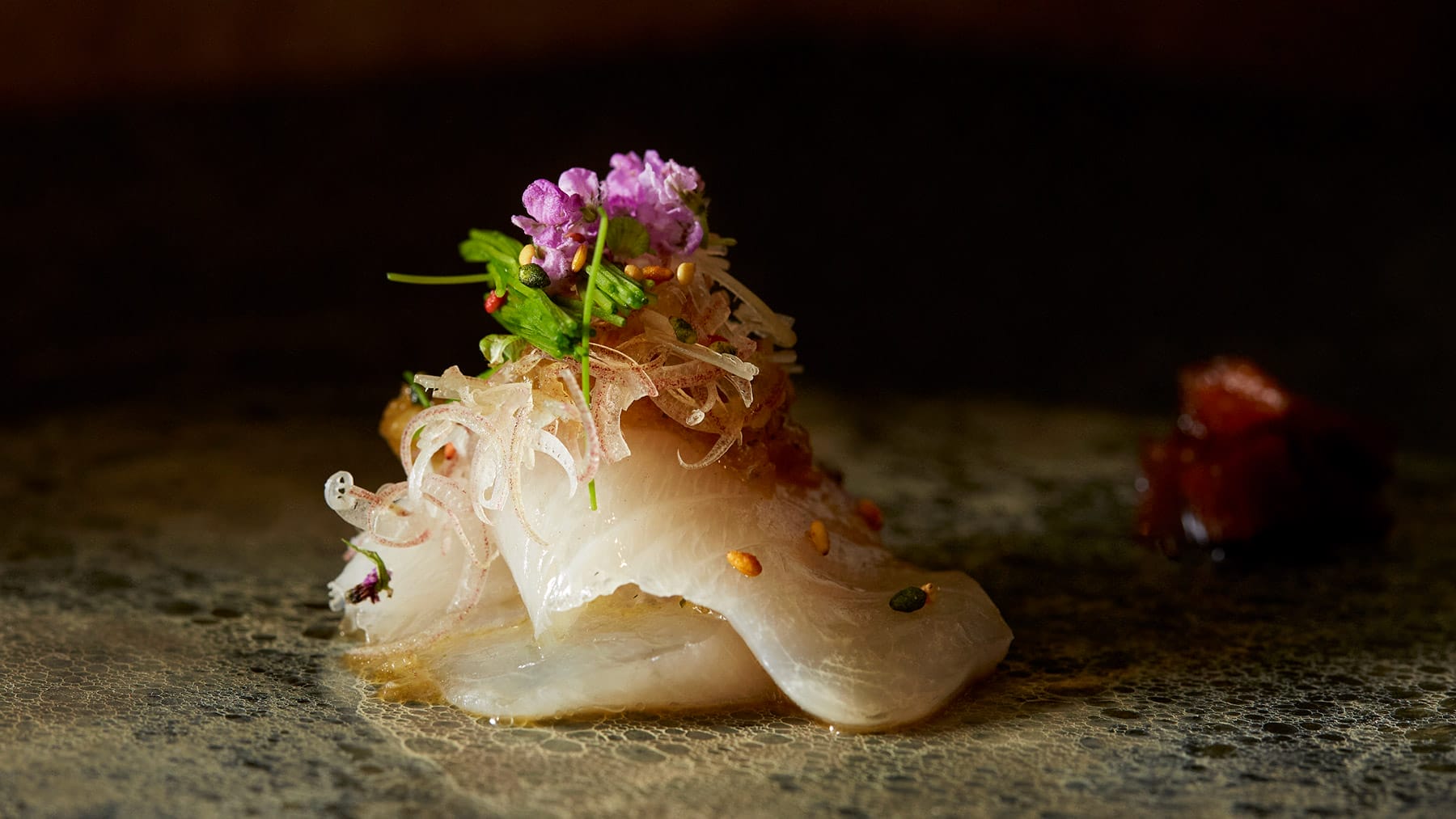 The menu would not be complete without sashimi, elegantly crafted with precision by Eng’s precise hand. Shima Aji, or striped jack, was first aged for six days to reveal a deepened sweetness with layers of umami, its texture transformed into a silky richness that offered a lingering and mellow finish. This was topped with floral and zesty accents from local bunga kantan (ginger torch flower), as well as the crisp, green freshness of baby spring onion.