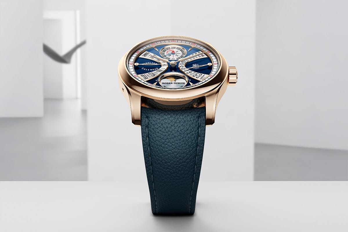 It is a round watch—only 38mm in diameter, if you can believe it—and rendered in fairly traditional fashion in pink gold, with not a single notch on the bezel. It sports a multilayered dial, packing a ton of information—the Roger Dubuis Hommage La Placide is a perpetual calendar, after all—on a blue lacquer backdrop. At 12 o’clock, month and leap year are told on a mother-of-pearl counter; the aventurine disc moonphase and its domed yellow gold moons sit at 6 o’clock. The signature retrograde displays of M Dubuis are at 3 and 9 o’clock, for date and day, respectively, and are executed in the bold, arcing typeface that is such a key part of his aesthetic.