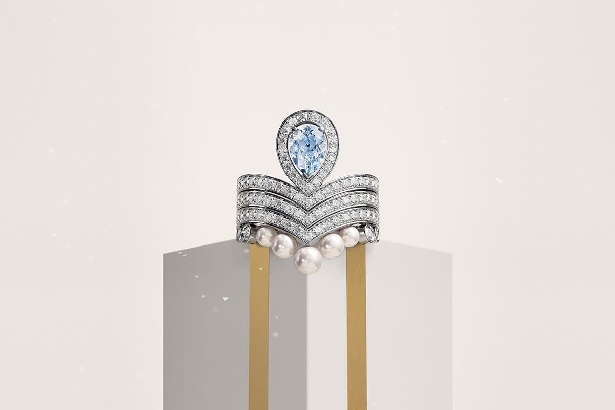 Snow and icicles may melt, but diamonds are forever—as they say. Present a symbol of your eternal love with rings of the Joséphine Aigrette collection, inspired by the tiaras worn by the empress and truly fit for the queen of your heart. These stackable rings offer infinite options of wearing, and truly combine elegance with a contemporary spirit. The set is crowned with a Joséphine Aigrette pavé diamond ring in white gold, set with the icy-blue brilliance of an aquamarine of 0.60 carats. A ring in white gold and diamonds, followed by a Joséphine Aigrette pavé diamond ring in white gold, set with Akoya cultured pearls and brilliant-cut diamonds, completes the trio.
