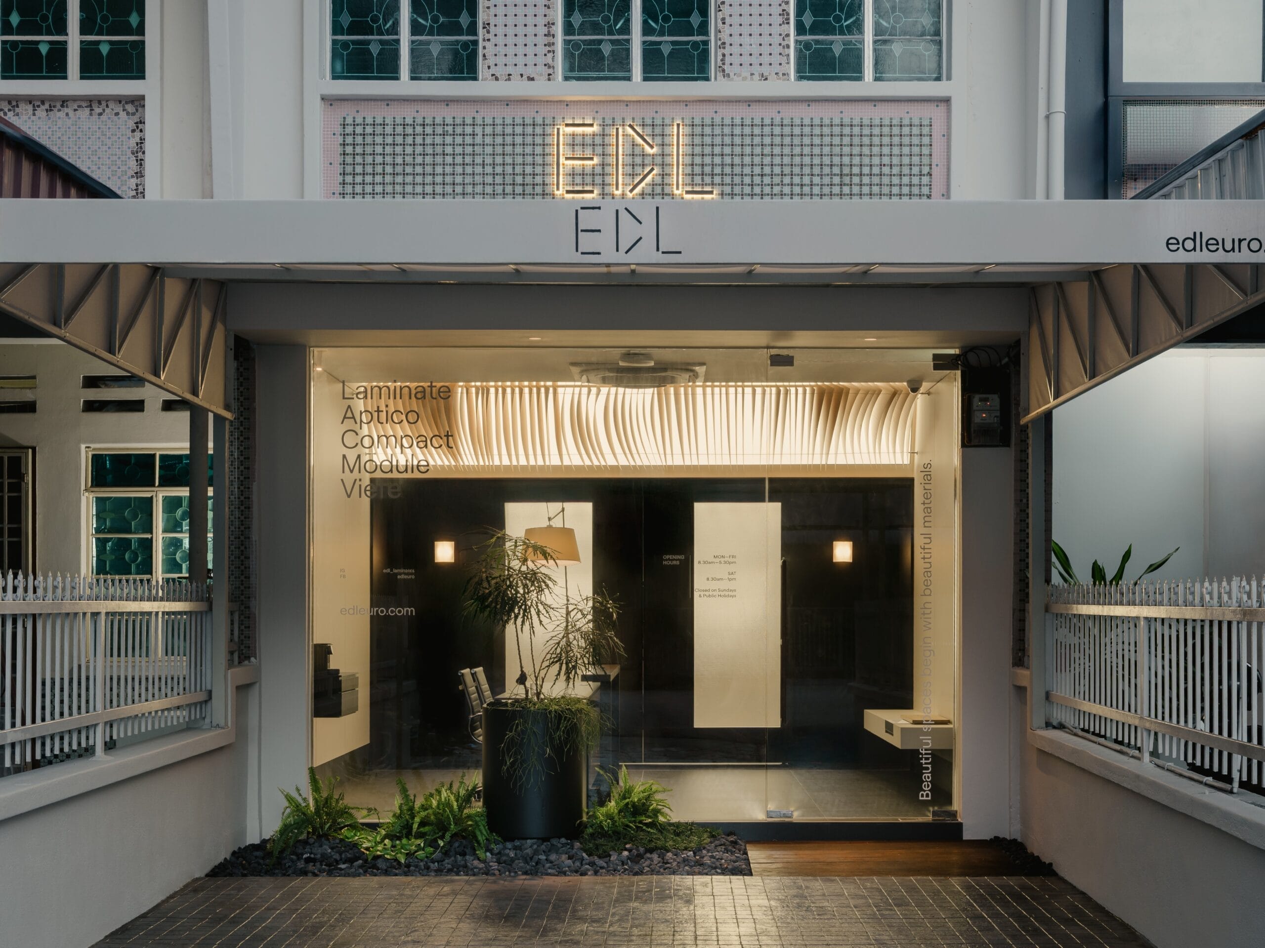 In collaboration with local design firm Empt Studio, a restored heritage shophouse along Jones Road in George Town was transformed into an immersive material showcase. EDL’s full range of materials—which includes laminates, compact worktops, module wall panels, and Viefe handles—creatively furnishes the building, interacting exquisitely with original pieces of tile and plaster. Alluringly tactile, the gallery’s focus on feel highlights a desire for browsers to meaningfully connect with their environment.